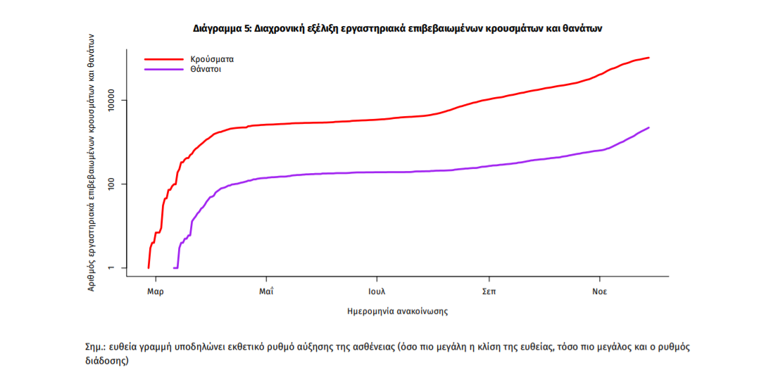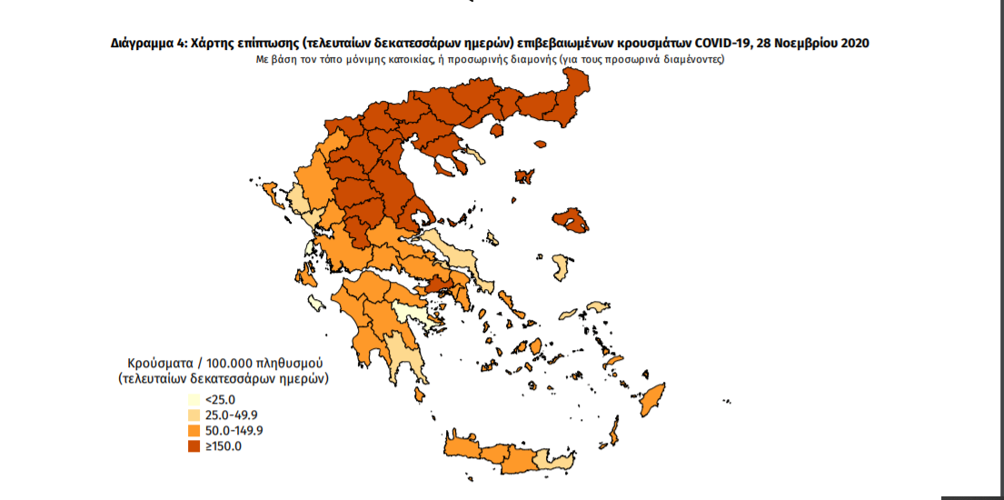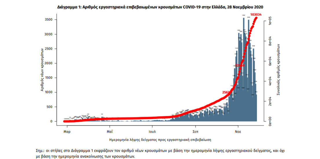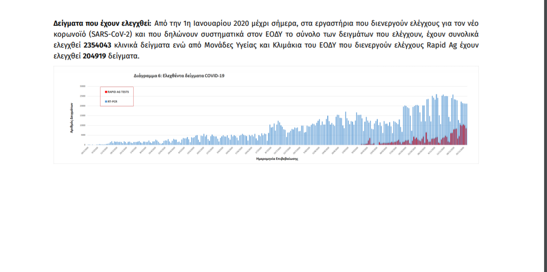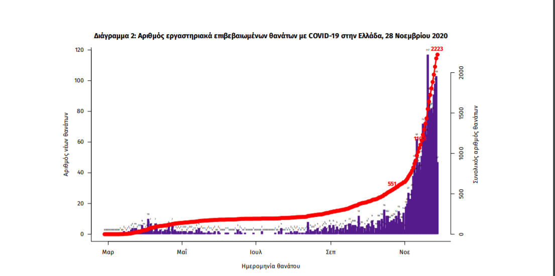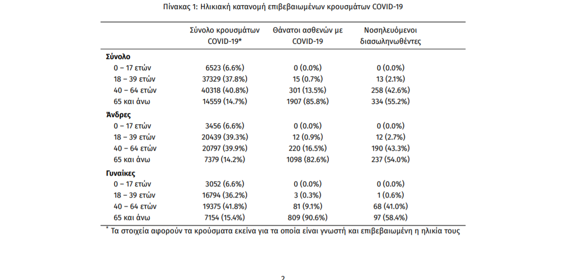Τέλος, έχουμε 121 ακόμα καταγεγραμμένους θανάτους και 2223 θανάτους συνολικά στη χώρα. 891 (40.1%) γυναίκες και οι υπόλοιποι άνδρες. Η διάμεση ηλικία των θανόντων συμπολιτών μας ήταν τα 80 έτη και το 96.8% είχε κάποιο υποκείμενο νόσημα ή/και ηλικία 70 ετών και άνω.