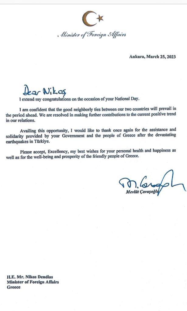Παράλληλα, ευχετήρια επιστολή στον Νίκο Δένδια, για την Εθνική Εορτή της 25ης Μαρτίου απέστειλε ο Υπουργός Εξωτερικών της Τουρκίας, Μεβλούτ Τσαβούσογλου.