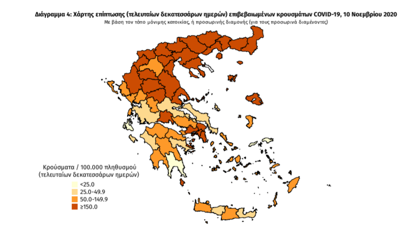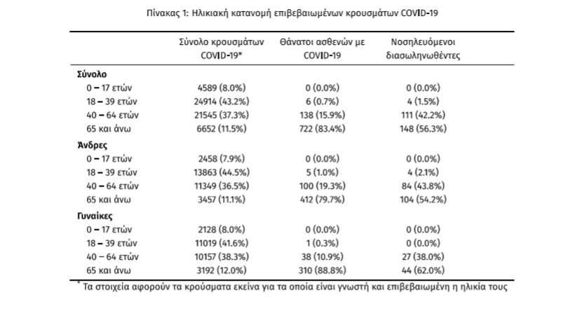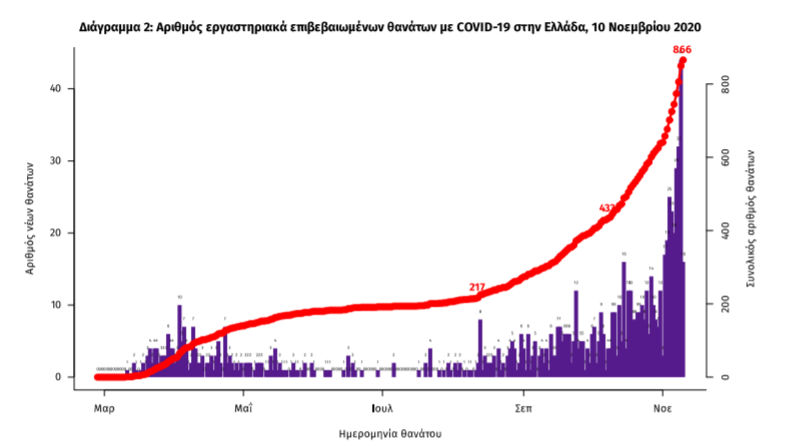 Τέλος, έχουμε 41 ακόμα καταγεγραμμένους θανάτους και 866 θανάτους συνολικά στη χώρα. 351 (40.5%) γυναίκες και οι υπόλοιποι άνδρες. Η διάμεση ηλικία των θανόντων συμπολιτών μας ήταν τα 79 έτη και το 96.5% είχε κάποιο υποκείμενο νόσημα ή/και ηλικία 70 ετών και άνω.
