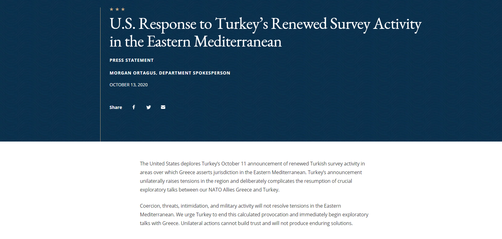 Η Ουάσιγκτον τονίζει ότι οι τουρκικές ενέργειες αυξάνουν μονομερώς την ένταση στην περιοχή και σκόπιμα περιπλέκουν την επανέναρξη των κρίσιμων διερευνητικών συνομιλιών μεταξύ των νατοϊκών εταίρων της Ελλάδας και της Τουρκίας.