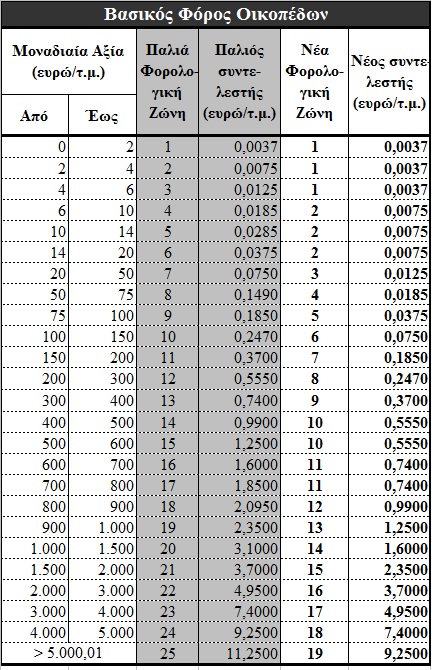• για τιμή ζώνης από 1.501 έως 2.500 ευρώ ο συντελεστής διαμορφώνεται σε 3,70 ευρώ/τ.μ., ενώ με το ισχύον καθεστώς για τιμή ζώνης από 1.501 έως 2.000 ευρώ ο συντελεστής είναι 4,5 ευρώ/τ.μ. και από 2.001 έως 2.500 είναι 6 ευρώ/τ.μ.