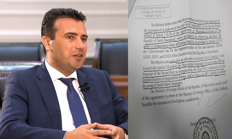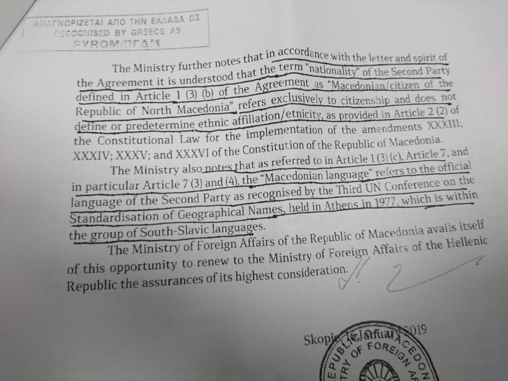 «Το Υπουργείο σημειώνει επίσης ότι, σύμφωνα με το γράμμα και το πνεύμα της Συμφωνίας, νοείται ότι ο όρος “εθνικότητα” του Δεύτερου Μέρους που ορίζεται στο Άρθρο 1 παράγραφος 3 στοιχείο β της Συμφωνίας ως “Μακεδονική/πολίτης της Δημοκρατίας της Βόρειας Μακεδονίας” αναφέρεται αποκλειστικά στην ιθαγένεια και δεν καθορίζει ή δεν προκαθορίζει την εθνοτική καταγωγή/εθνότητα, όπως προβλέπεται στο Άρθρο 2 (2) του Συνταγματικού Νόμου για την εφαρμογή των τροποποιήσεων XXXIII, XXXIV, XXXV και XXXVI του Συντάγματος της Δημοκρατίας της Μακεδονίας.