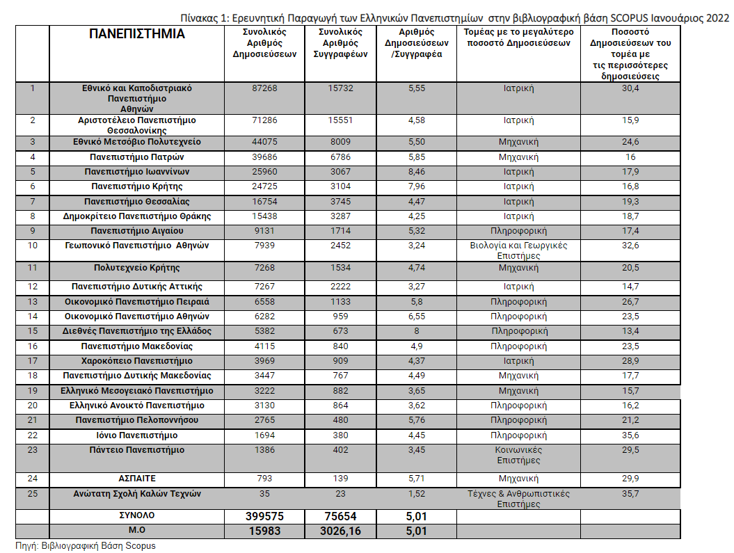 Σύμφωνα με τα στοιχεία που συγκεντρώθηκαν από τη βάση και αφορούν την ερευνητική παραγωγή των ελληνικών πανεπιστημίων έως και τις 5 Ιανουαρίου 2022, το Εθνικό και Καποδιστριακό Πανεπιστήμιο Αθηνών βρίσκεται στην πρώτη θέση μεταξύ των ελληνικών πανεπιστημίων με 87.268 ερευνητικά κείμενα. Επιπροσθέτως και για πρώτη φορά την τελευταία πενταετία το ΕΚΠΑ έρχεται πρώτο και στον συνολικό αριθμό συγγραφέων (βλ. Πίνακα 1). Παράλληλα θα πρέπει να επισημανθεί ότι: