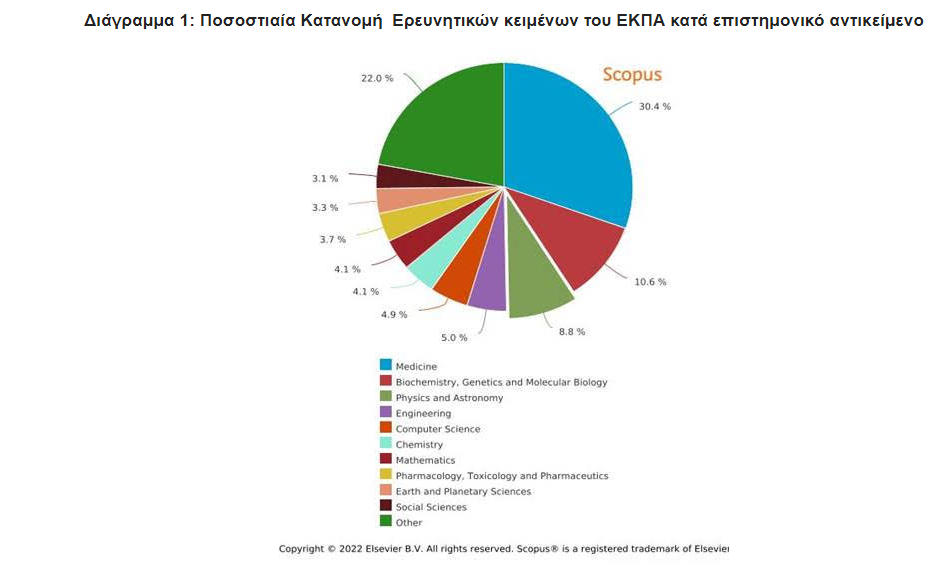 (ε) Όπως φαίνεται στο διάγραμμα 1, το οποίο έχει παραχθεί μέσα από τη βάση Scopus και παρουσιάζει την ποσοστιαία κατανομή ερευνητικών κειμένων του ΕΚΠΑ κατά επιστημονικό αντικείμενο, το 30,4% προέρχεται από τον χώρο της Ιατρικής. Ακολουθούν η Βιοχημεία-Γενετική & Μοριακή Βιολογία με 10,6% και η Φυσική & Αστρονομία με 8,8%