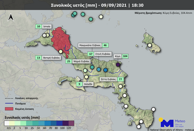 Στο χάρτη, του δικτύου αυτόματων μετεωρολογικών σταθμών του ΕΑΑ/meteo.gr που ακολουθεί με κόκκινο αποτυπώνεται η καμένη έκταση από τις μεγάλες πυρκαγιές του Αυγούστου, ενώ επισημαίνονται οι θέσεις των μετεωρολογικών σταθμών και τα ύψη βροχόπτωσης που έχουν καταγράψει.
