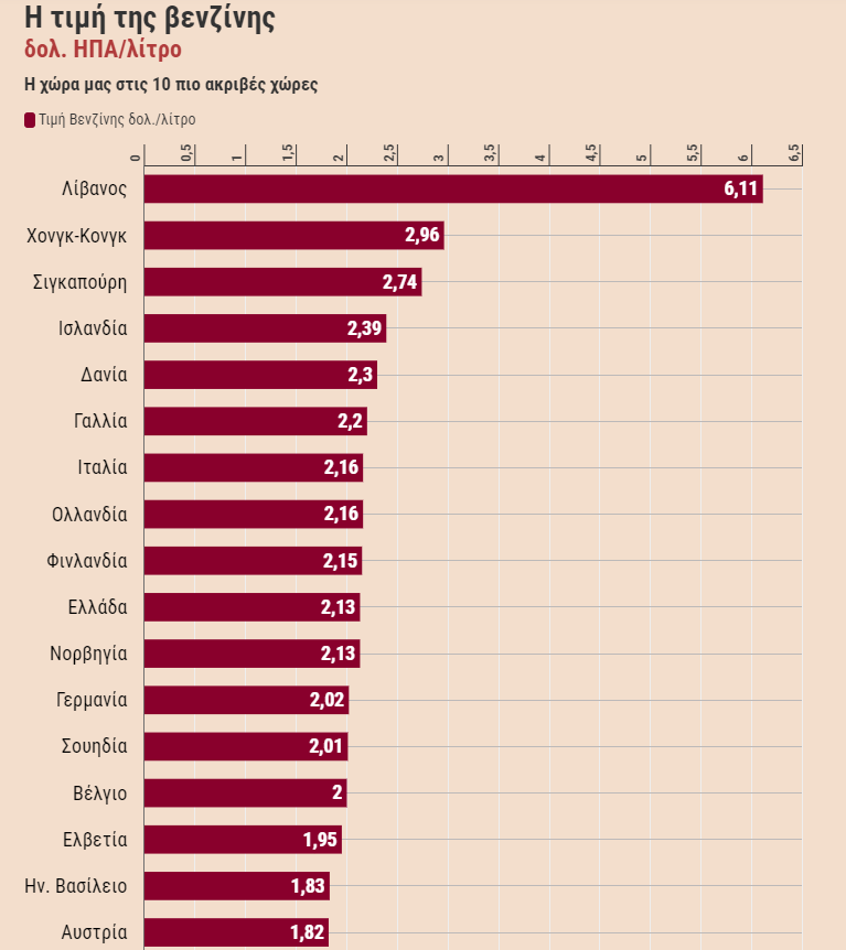 Στην πρώτη θέση της σχετικής λίστας βρίσκεται ο πολύπαθος Λίβανος, όπου η κακή οικονομική κατάσταση και η κατάργηση επιδοτήσεων για τα καύσιμα πέρσι από την κεντρική τράπεζα της χώρας έχει οδηγήσει στις τιμές στα 6,11 δολάρια το λίτρο.