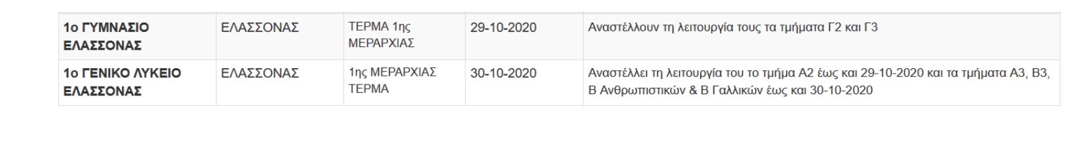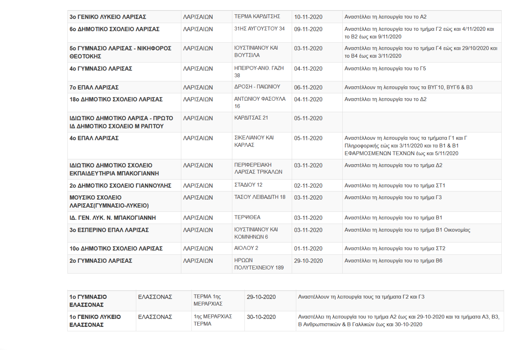 Aυτά είναι τα σχολικά τμήματα που έχουν αναστείλει τη λειτουργία τους στην Π.Ε. Λάρισας