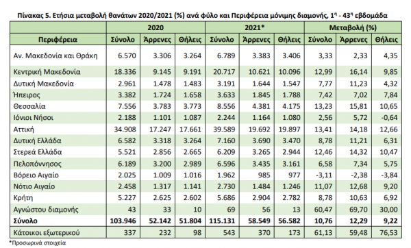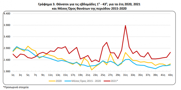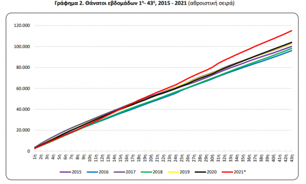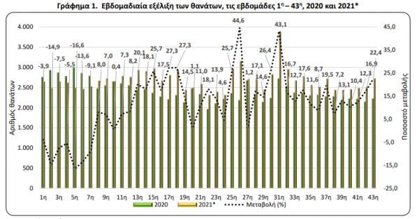 Σύμφωνα με την ΕΛΣΤΑΤ, αύξηση κατά 14.381 θανάτους (14,27%) σημειώθηκε σε σχέση με τον μέσο όρο των πρώτων 43 εβδομάδων της εξαετίας 2015- 2020 (100.750 θάνατοι). Τα αντίστοιχα ποσοστά, ανά έτος, για την περίοδο 2015- 2020 ανέρχονται σε 0,68% το 2020 σε σχέση με το 2019 (103.246), σε 5,19% το 2019 σε σχέση με το 2018 (98.156), σε -4,73% το 2018 σε σχέση με το 2017 (103.028), σε 7,26% το 2017 σε σχέση με το 2016 (96.051) και σε -4,02% το 2016 σε σχέση με το 2015 (100.074).
