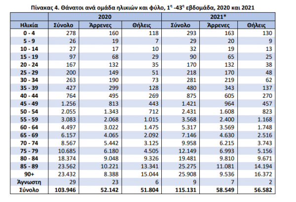 Ειδικότερα, σε 115.131 (58.549 άνδρες και 56.582 γυναίκες) ανήλθαν οι θάνατοι στην Ελλάδα τις 43 πρώτες εβδομάδες του 2021 (4/1/2021- 31/10/2021), ενώ κατά τις αντίστοιχες 43 εβδομάδες του 2020 (30/12/2019- 5/10/2020) είχαν ανέλθει σε 103.946 (52.142 άνδρες και 51.804 γυναίκες), σημειώνοντας αύξηση 10,76%.