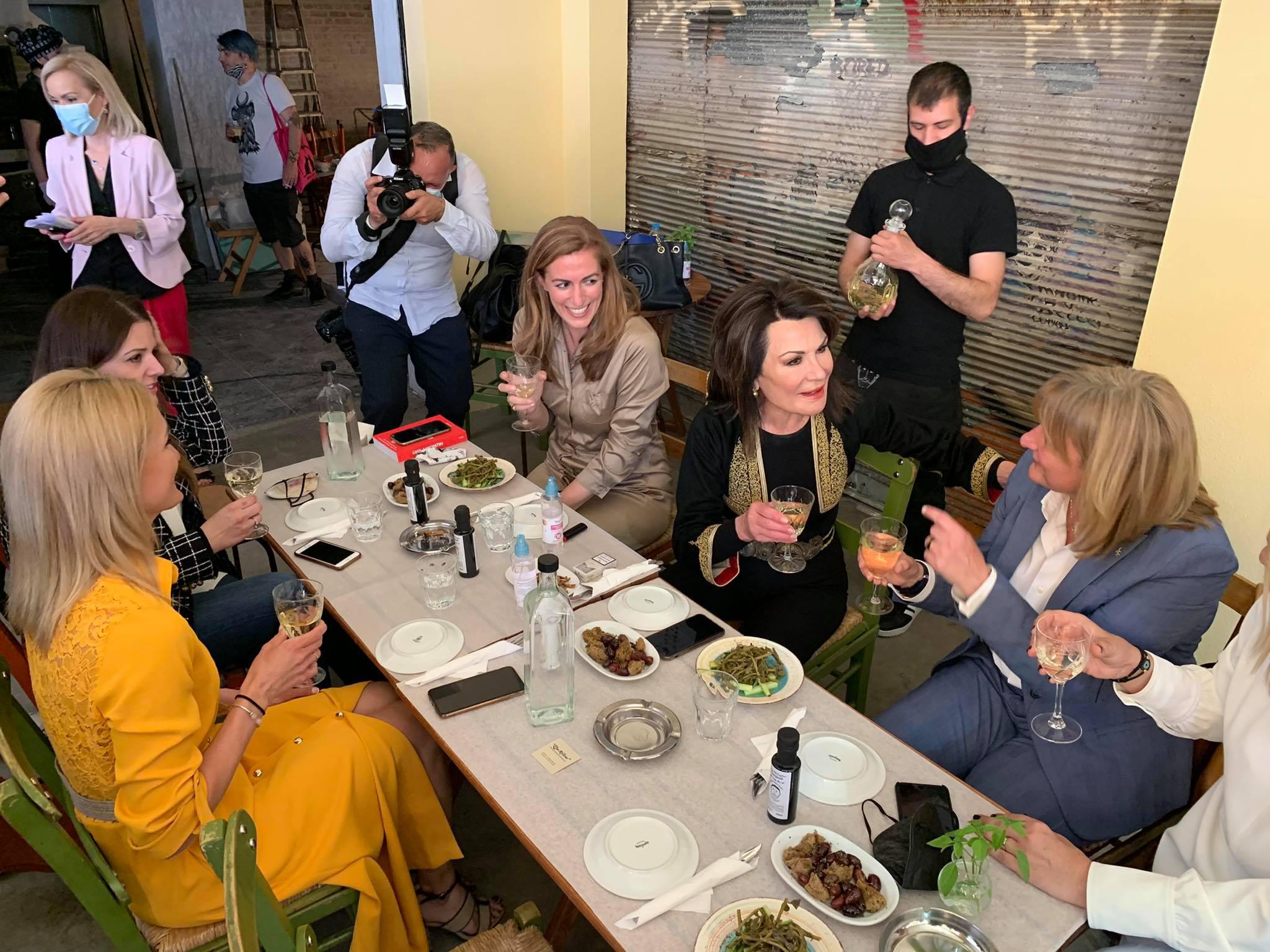 Στο μαγαζί την περίμεναν βουλευτίνες του νομού Θεσσαλονίκης και γυναίκες της οργάνωσης «women act». Μεταξύ αυτών οι βουλεύτριες Έλενα Ράπτη και Άννα Ευθυμίου της ΝΔ, η Κατερίνα Νοτοπούλου και η Δώρα Αυγέρη του ΣΥΡΙΖΑ, η Κωνσταντίνα Αδάμου του ΜέΡΑ 25, η αντιδήμαρχος Τουρισμού του δήμου Θεσσαλονίκης, Μαρία Καραγιάννη, η επικεφαλής του γραφείου του Πρωθυπουργού στη Θεσσαλονίκη, Μαρία Αντωνίου, η πρόεδρος της Επιτροπής του «Καυτανζογλείου», Καλυψώ Γούλα και η σύζυγος του Απόστολου Τζιτζικώστα, Ελεάνα Βλάχου.