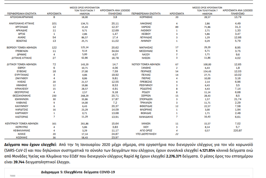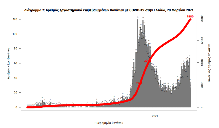 Οι νέοι θάνατοι ασθενών με COVID-19 είναι 54, ενώ από την έναρξη της επιδημίας έχουν καταγραφεί συνολικά 7.880 θάνατοι. Το 95.7% είχε υποκείμενο νόσημα ή/και ηλικία 70 ετών και άνω
