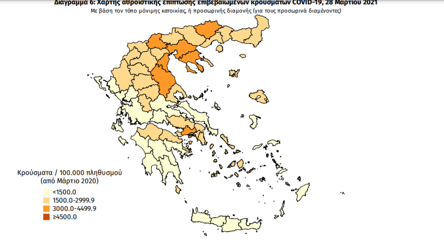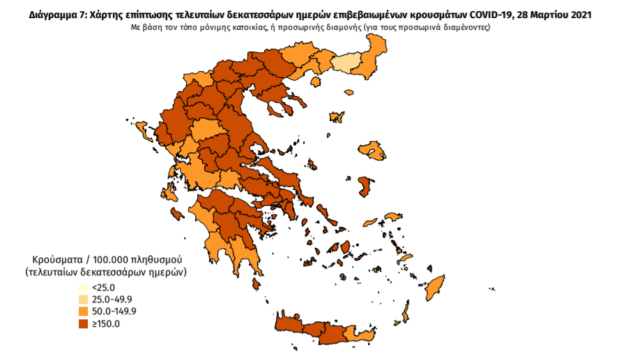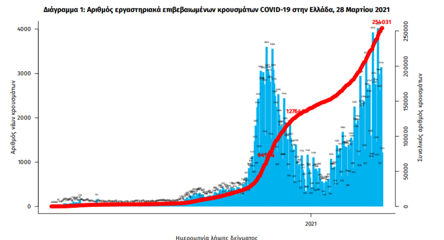 Τα νέα εργαστηριακά επιβεβαιωμένα κρούσματα της νόσου που καταγράφηκαν τις τελευταίες 24 ώρες είναι 1.449, εκ των οποίων 11 εντοπίστηκαν κατόπιν ελέγχων στις πύλες εισόδου της χώρας. Ο συνολικός αριθμός των κρουσμάτων ανέρχεται σε 254.031 (ημερήσια μεταβολή +0.6%), εκ των οποίων 51.5% άνδρες. 1 Με βάση τα επιβεβαιωμένα κρούσματα των τελευταίων 7 ημερών, 55 θεωρούνται σχετιζόμενα με ταξίδι από το εξωτερικό και 2.605 είναι σχετιζόμενα με ήδη γνωστό κρούσμα.