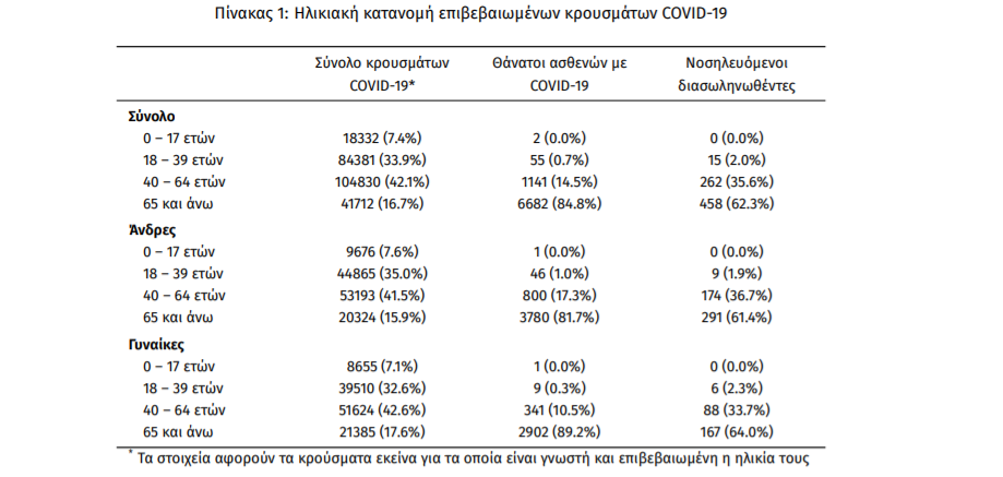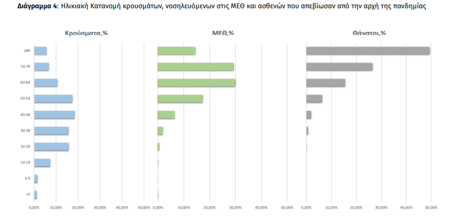 Ο αριθμός των ασθενών που νοσηλεύονται διασωληνωμένοι είναι 735 (64.4% άνδρες). Η διάμεση ηλικία τους είναι 68 έτη. To 82.3% έχει υποκείμενο νόσημα ή/και ηλικία 70 ετών και άνω. Από την αρχή της πανδημίας έχουν εξέλθει από τις ΜΕΘ 1.664 ασθενείς. Οι εισαγωγές2 νέων ασθενών Covid-19 στα νοσοκομεία της επικράτειας είναι 422 (ημερήσια μεταβολή +13.75%). Ο μέσος όρος εισαγωγών του επταημέρου είναι 438 ασθενείς.Η διάμεση ηλικία των κρουσμάτων είναι 44 έτη (εύρος 0.2 έως 105 έτη), ενώ η διάμεση ηλικία των θανόντων είναι 79 έτη (εύρος 0 έως 103 έτη).