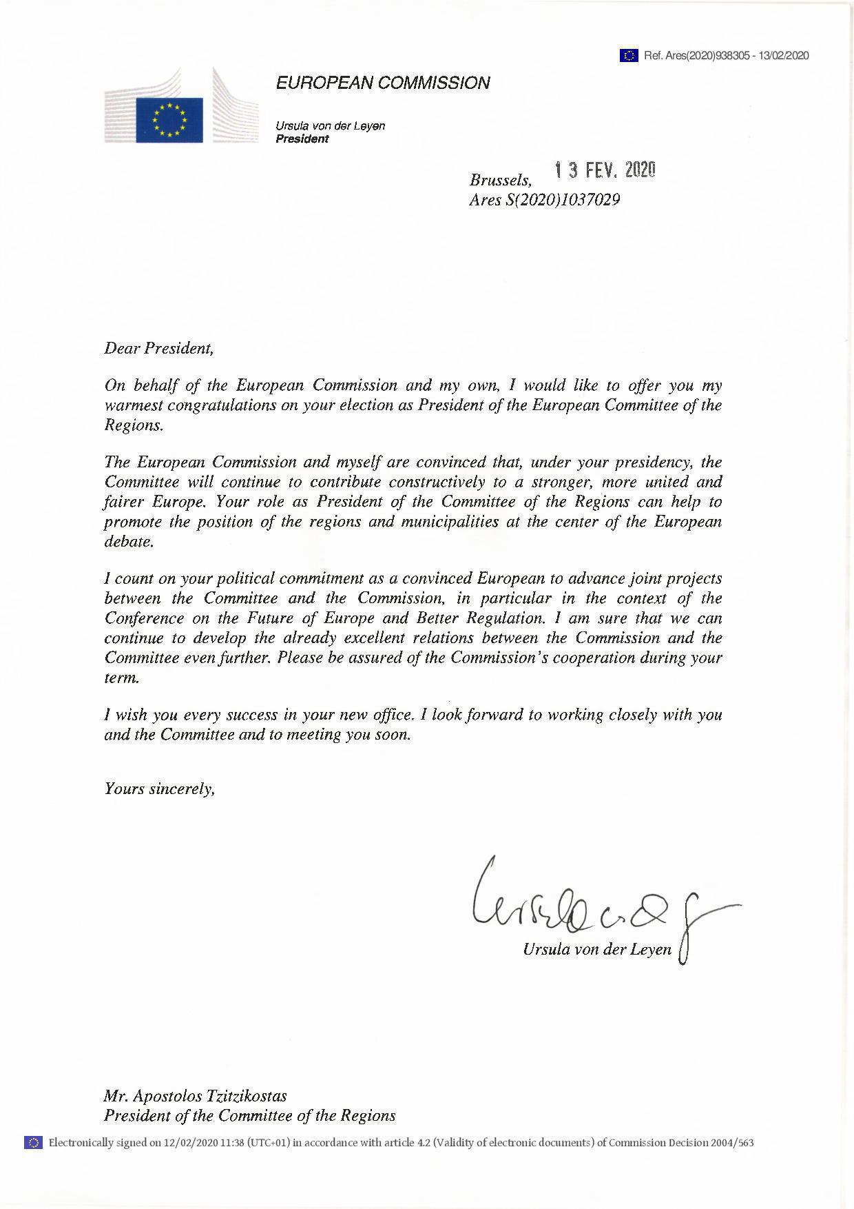 Η Πρόεδρος της Κομισιόν στην προσωπική επιστολή της στον νέο Πρόεδρο της Επιτροπής των Περιφερειών της Ευρωπαϊκής Ένωσης συγχαίρει προσωπικά, αλλά και εκ μέρους της Ευρωπαϊκής Επιτροπής τον κ. Τζιτζικώστα για την εκλογή του στην προεδρία της Ευρωπαϊκής Επιτροπής των Περιφερειών, σημειώνοντας ότι «η Κομισιόν κι εγώ είμαστε πεπεισμένοι ότι υπό την προεδρία σας η Επιτροπή θα συνεχίσει να συμβάλλει εποικοδομητικά σε μια πιο ισχυρή, πιο ενωμένη και πιο δίκαιη Ευρώπη».