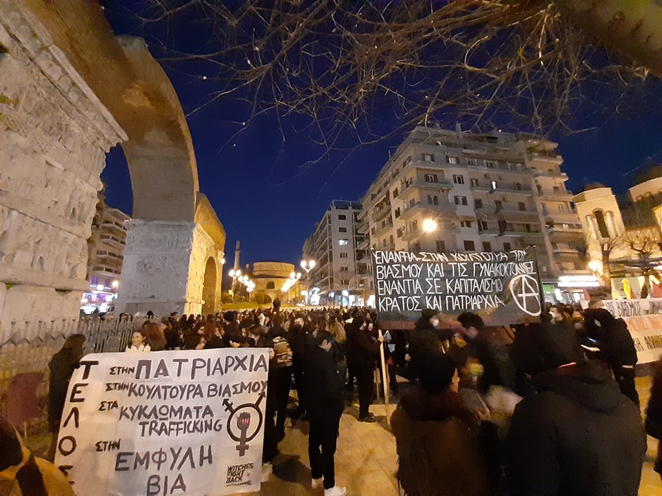 Πλήθος κόσμου βρέθηκε στην Καμάρα από τις 18.00 με συνθήματα και μεγάλα πανό για να ενώσουν τις φωνές τους και να φωνάξουν “Ποτέ καμία μόνη” και “Κάτω τα χέρια από τα σώματα μας” σε μία πατριαρχική κοινωνία που θα πρέπει να μάθει από τα λάθη και τα εγκλήματα της.