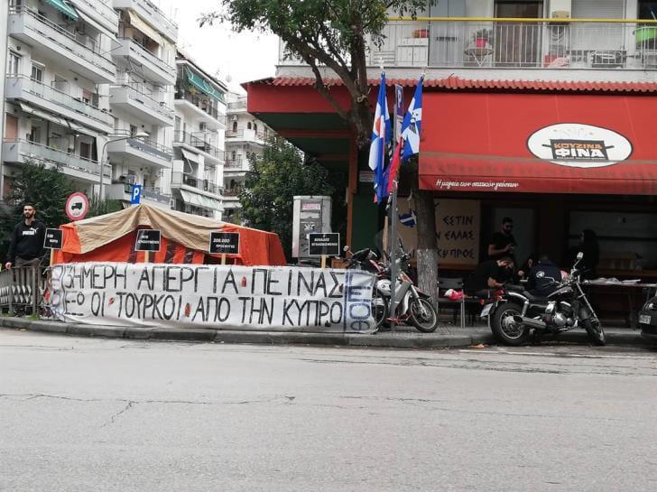 Νωρίτερα σήμερα ξεκίνησαν στο σημείο τριήμερη απεργία πείνας. Οι απεργοί πείνας ενημερώνουν τους πολίτες της Θεσσαλονίκης για την παράνομη ανακήρυξη του ψευδοκράτους και τα τεκταινόμενα της πατρίδας τους.