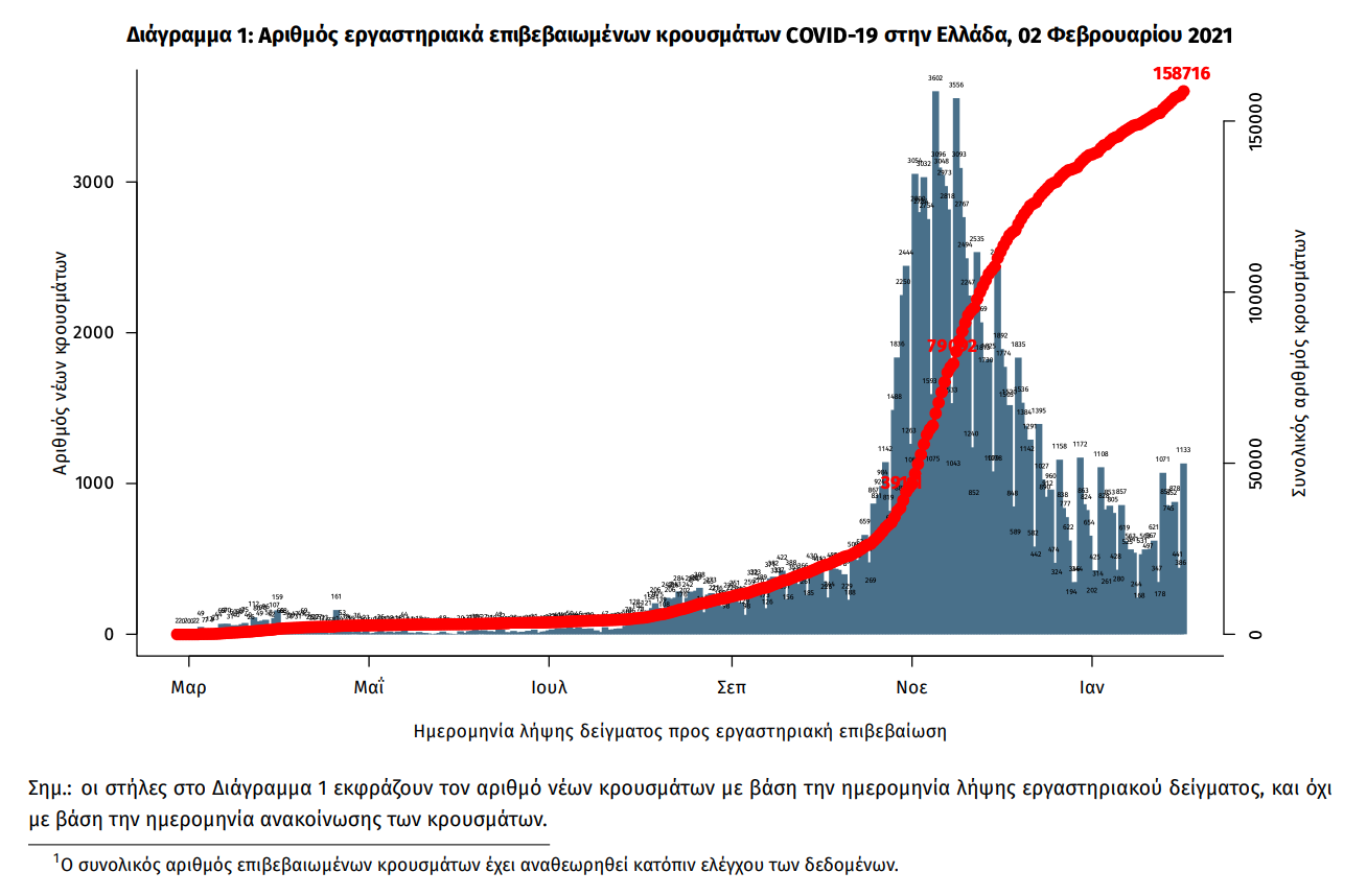 Τα στοιχεία που παρουσιάζονται αφορούν περιστατικά από την επιδημιολογική επιτήρηση της νόσου από το νέο κορωνοϊό (COVID19), με βάση τα δεδομένα που έχουν δηλωθεί στον ΕΟΔΥ και καταγραφεί μέχρι τις 02 Φεβρουαρίου 2021 (ώρα 15:00). Τα νέα εργαστηριακά επιβεβαιωμένα κρούσματα της νόσου είναι 1261, εκ των οποίων 18 εντοπίστηκαν κατόπιν ελέγχων στις πύλες εισόδου της χώρας.