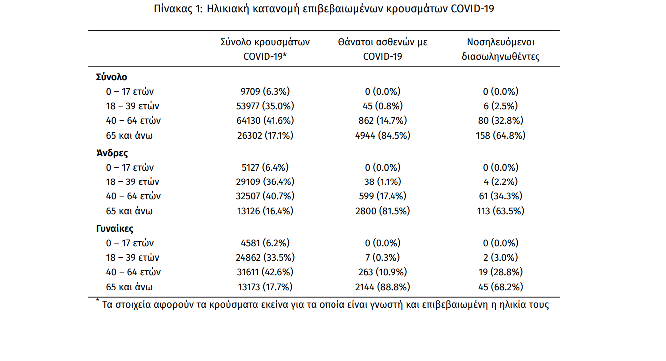 Η διάμεση ηλικία των κρουσμάτων είναι 44 έτη (εύρος 0.2 έως 105 έτη), ενώ η διάμεση ηλικία των θανάτων είναι 79 έτη (εύρος 24 έως 103 έτη). Η ηλικιακή κατανομή των (α) συνολικών κρουσμάτων, (β) των περιστατικών που κατέληξαν σε θάνατο και (γ) των ασθενών που νοσηλεύονται διασωληνωμένοι, είναι η ακόλουθη: