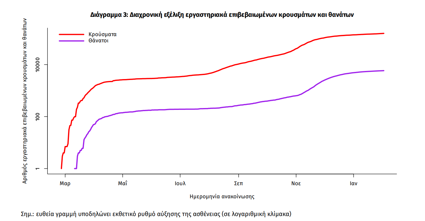 Η διαχρονική εξέλιξη των συνολικών κρουσμάτων και συνολικού αριθμού των θανάτων ασθενών COVID-19 παρουσιάζεται στο ακόλουθο διάγραμμα.