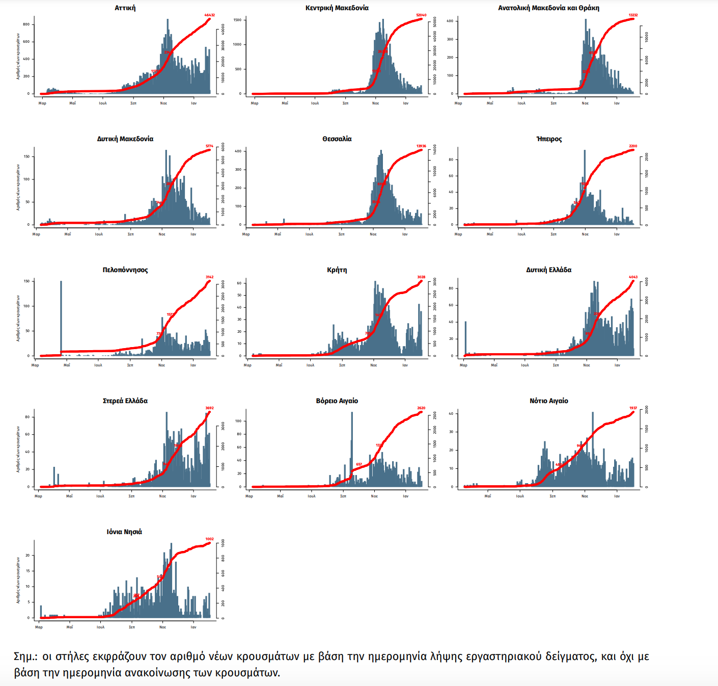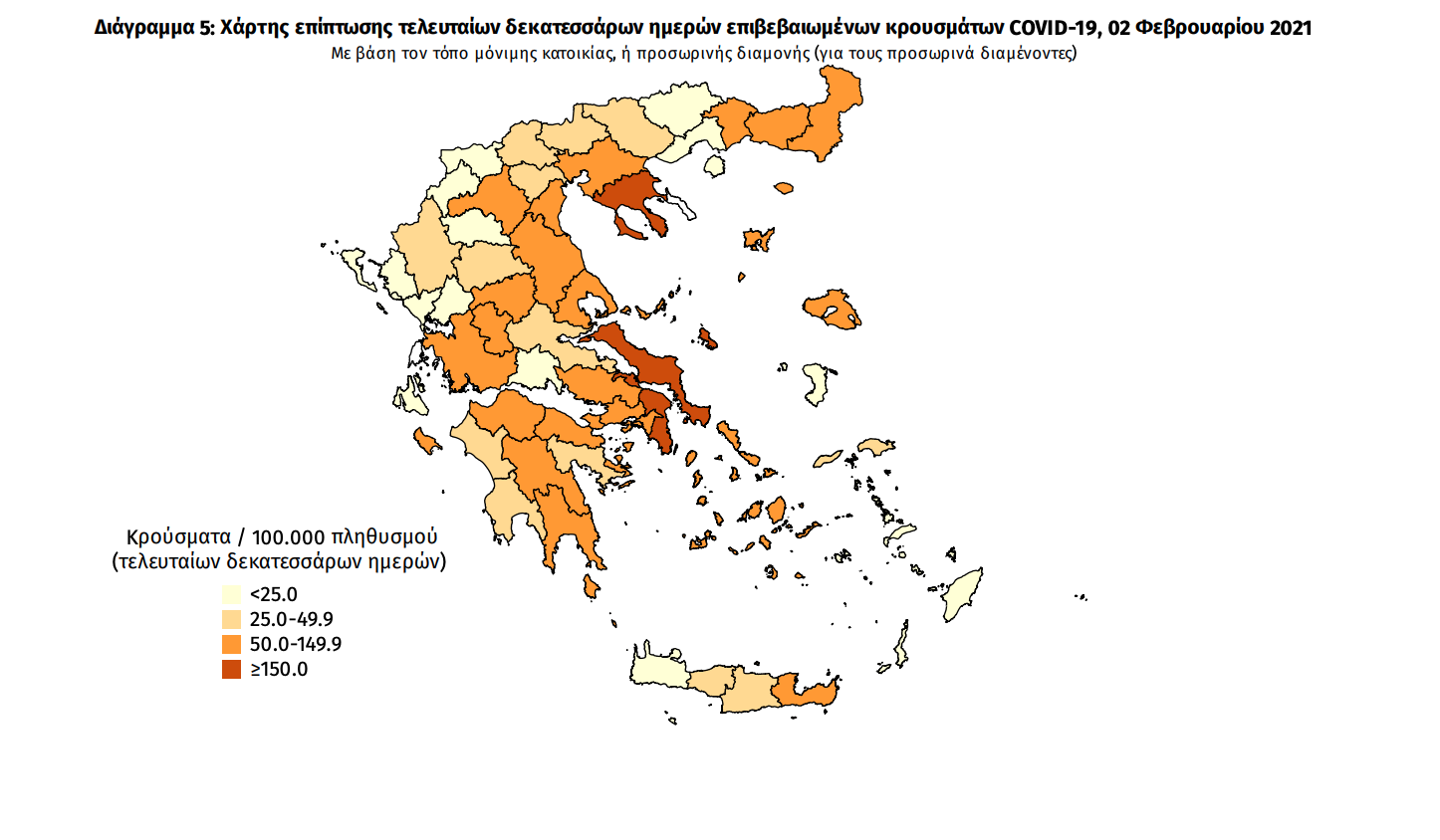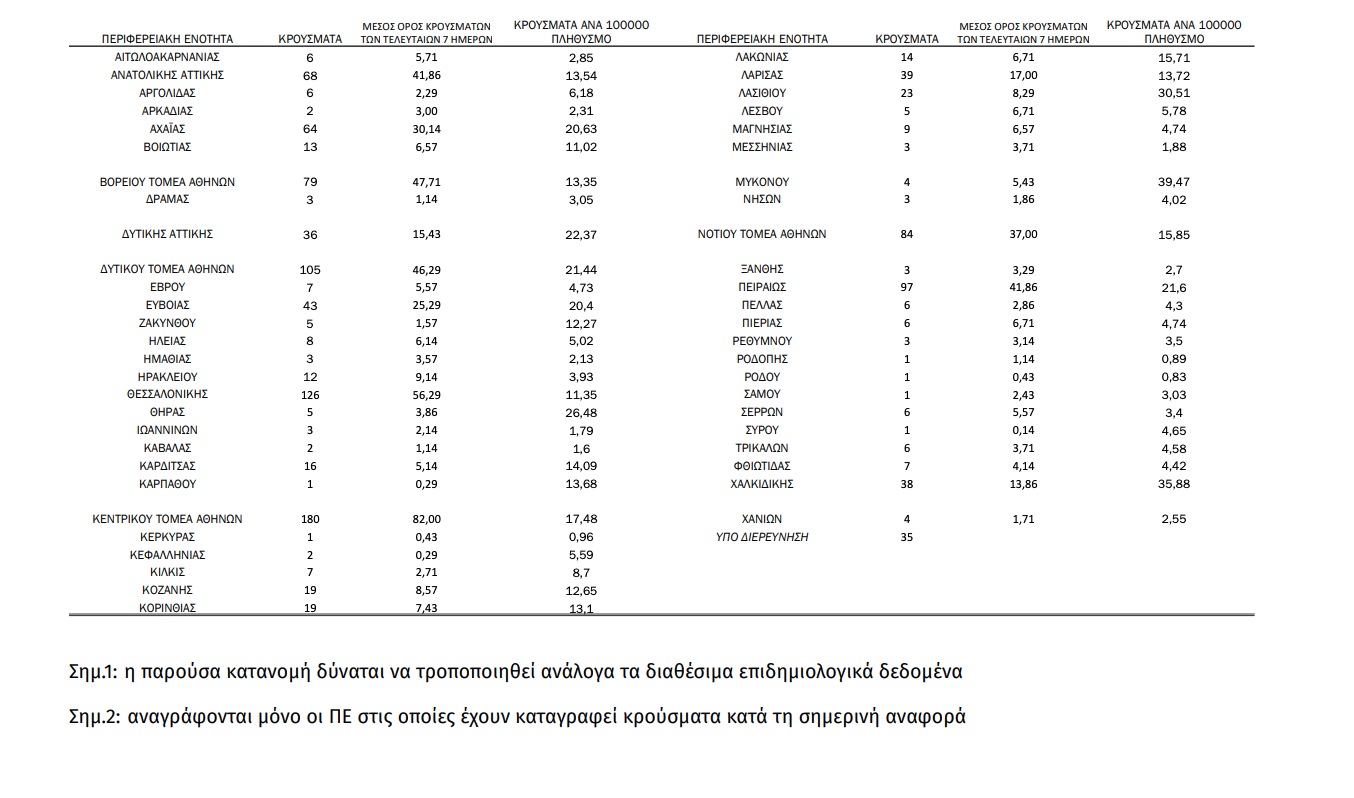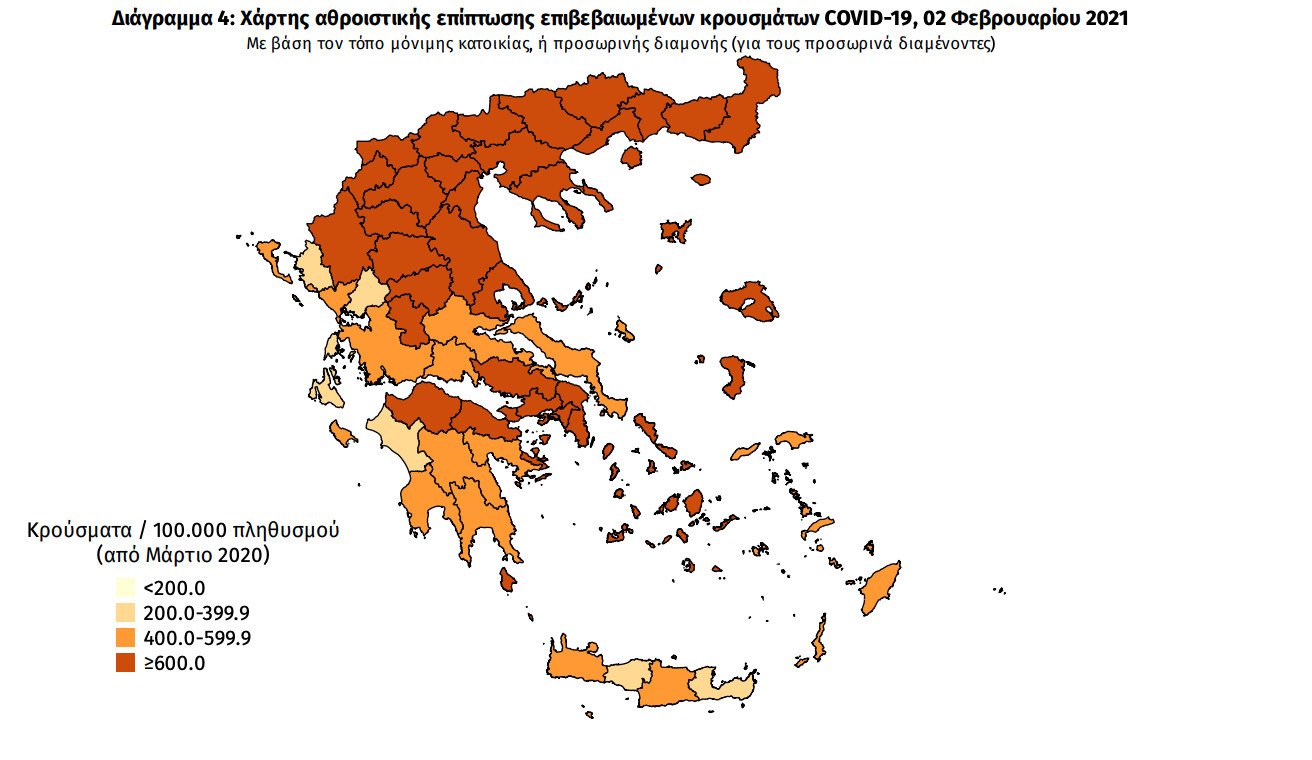 Γεωγραφική διασπορά Ο χάρτης αποτυπώνει τη γεωγραφική κατανομή των συνολικών κρουσμάτων COVID-19 (από την αρχή της επιδημίας) ανά Περιφερειακή Ενότητα της χώρας, με βάση την δηλωθείσα διεύθυνση μόνιμης κατοικίας του ασθενούς, ή τη διεύθυνση προσωρινής διαμονής για τους τουρίστες και άλλους προσωρινά διαμένοντες στην Ελλάδα. Συμπεριλαμβάνονται τόσο κρούσματα με ιστορικό ταξιδίου (“εισαγόμενα”) όσο και κρούσματα με πιθανή εγχώρια μετάδοση.