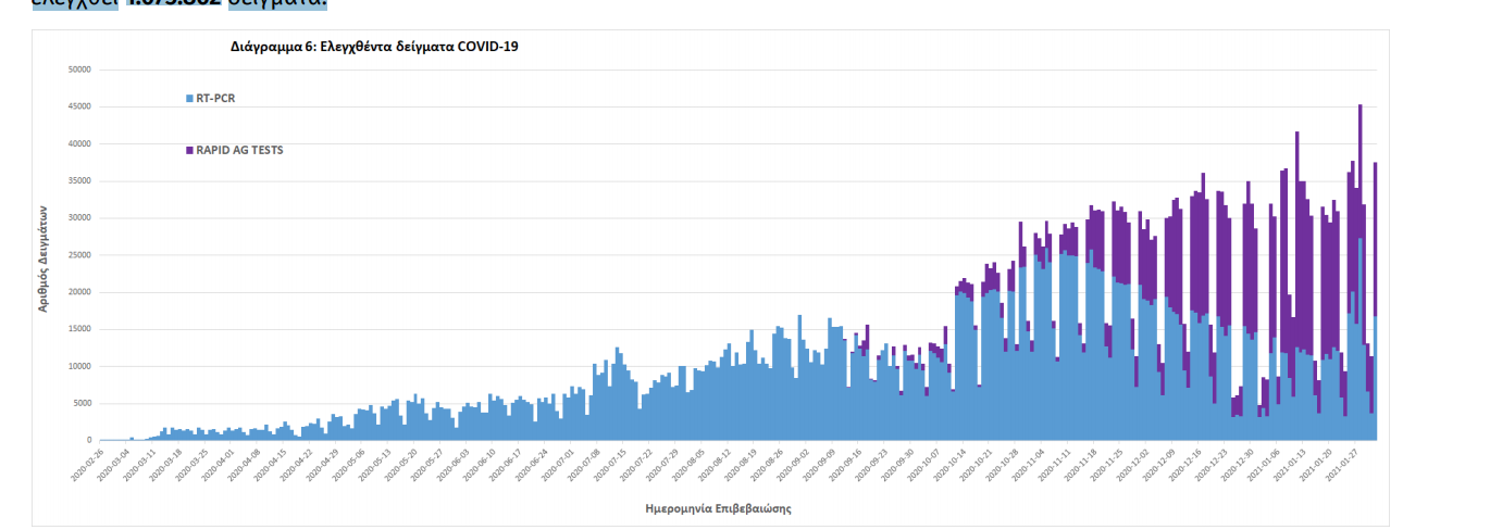 Δείγματα που έχουν ελεγχθεί: Από την 1η Ιανουαρίου 2020 μέχρι σήμερα, στα εργαστήρια που διενεργούν ελέγχους για τον νέο κορωνοϊό (SARS-CoV-2) και που δηλώνουν συστηματικά στον ΕΟΔΥ το σύνολο των δειγμάτων που ελέγχουν, έχουν συνολικά ελεγχθεί 3.154.395 κλινικά δείγματα ενώ από Μονάδες Υγείας και Κλιμάκια του ΕΟΔΥ που διενεργούν ελέγχους Rapid Ag έχουν ελεγχθεί 1.075.862 δείγματα.