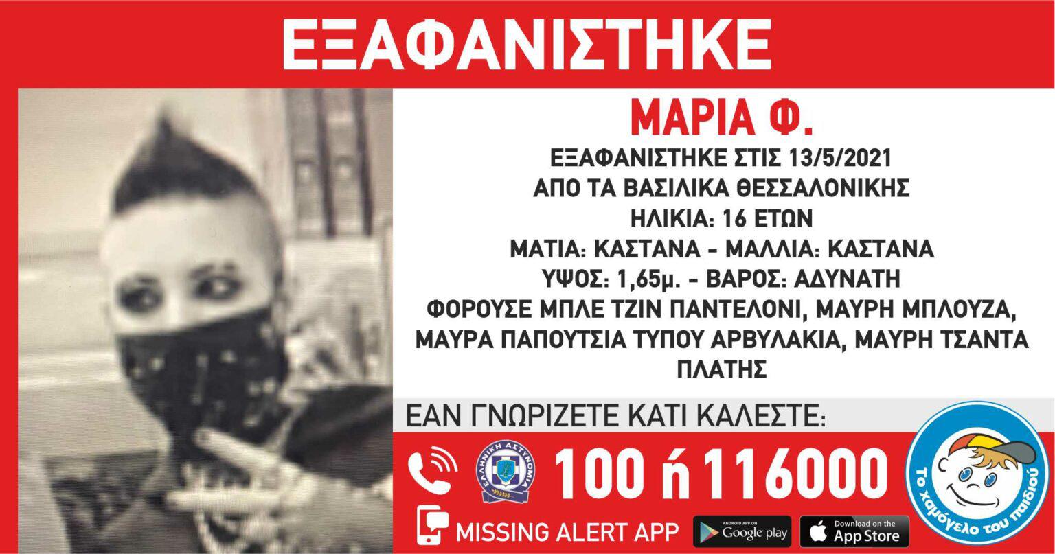 Στις 13/05/2021 μεσημεριανές ώρες, εξαφανίστηκε από τα Βασιλικά Θεσσαλονίκης, η Μαρία Φ. 16 ετών.