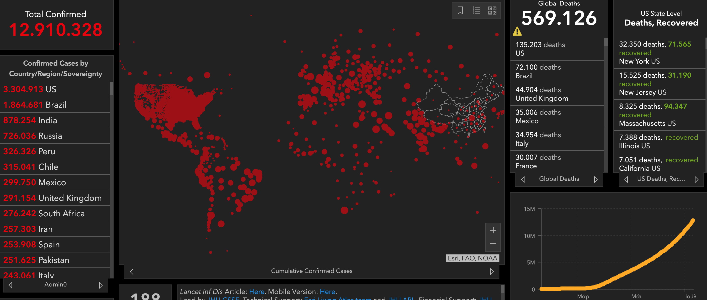 Οι θάνατοι εξαιτίας της COVID-19 έφθασαν τους 135.171 (+442 σε ένα 24ωρο), σύμφωνα με αυτή τη σχολή ιατρικής της Βαλτιμόρης (ανατολικά).