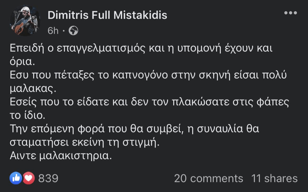Το τραγικό περιστατικό- που θέτει σε κίνδυνο την ασφάλεια των μουσικών- έσπευσε να σχολιάσει ο Δημήτρης Μυστακίδης. Ο ίδιος έγραψε:
