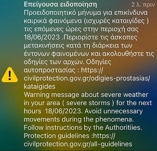 Νωρίτερα, 112 είχε σταλεί και στους πολίτες των βορείων προαστίων της Αθήνας, ώστε όσοι μένουν στην περιοχή να αποφύγουν τις άσκοπες μετακινήσεις λόγω της κακοκαιρίας. «Προειδοποιητικό μήνυμα για επικίνδυνα καιρικά φαινόμενα τις επόμενες ώρες στην περιοχή σας. Περιορίστε τις άσκοπες μετακινήσεις», αναφέρει το μήνυμα.