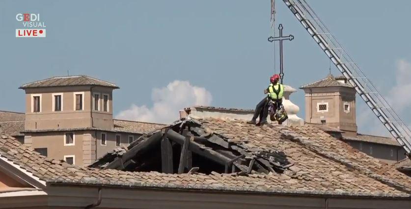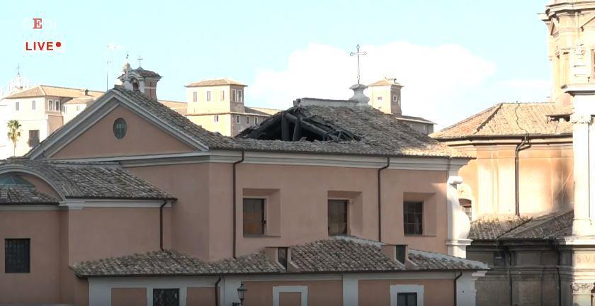 Ξύλινα δοκάρια και κεραμικά πλακίδια έπεσαν στο πάτωμα της εκκλησίας και ένα δοκάρι διαπέρασε το πάτωμα και τη θολωτή οροφή ενός παρεκκλησίου που βρισκόταν από κάτω, είπε ο εκπρόσωπος της πυροσβεστικής Λουίτζι Λιόλι λίγη ώρα αφού επιθεώρησε τη ζημιά.