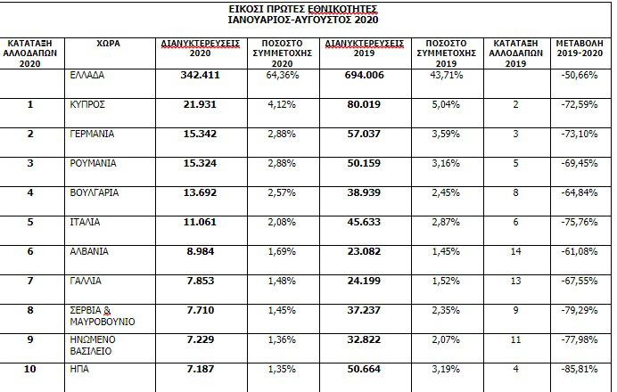 Στην πρώτη θέση του πίνακα βρέθηκαν οι Κύπριοι επισκέπτες, με 21.931 διανυκτερεύσεις το φετινό οκτάμηνο έναντι 80.019 του αντίστοιχου περσινού διαστήματος και σημαντικότατη πτώση της τάξης του 75,59%.