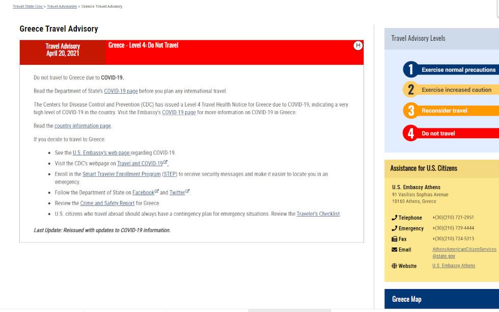 Ταξιδιωτική οδηγία COVID των ΗΠΑ και για την Ελλάδα