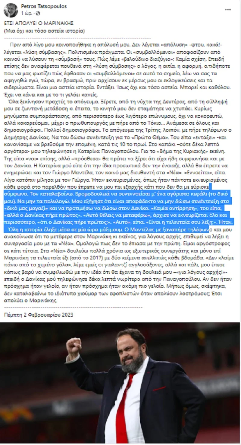 «Έτσι απολύει ο Μαρινάκης...» - Ολόκληρη η ανάρτηση του συγγραφέα