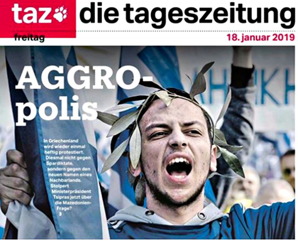 Η εφημερίδα Tageszeitung κυκλοφορεί με πρωτοσέλιδο τίτλο «Aggropolis» (σ.σ. από το aggressiv, δηλαδή επιθετικός), που συνοδεύεται από φωτογραφία Έλληνα διαδηλωτή, ο οποίος φοράει στεφάνι δάφνης και κρατά την ελληνική σημαία. Στο, επίσης, πρωτοσέλιδο σχόλιο υπό τον τίτλο «Η επιδημία του εθνικισμού», υπογραμμίζεται ότι ο εθνικισμός εξαπλώνεται με γοργούς ρυθμούς στην Ευρώπη: