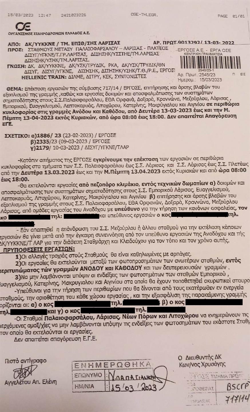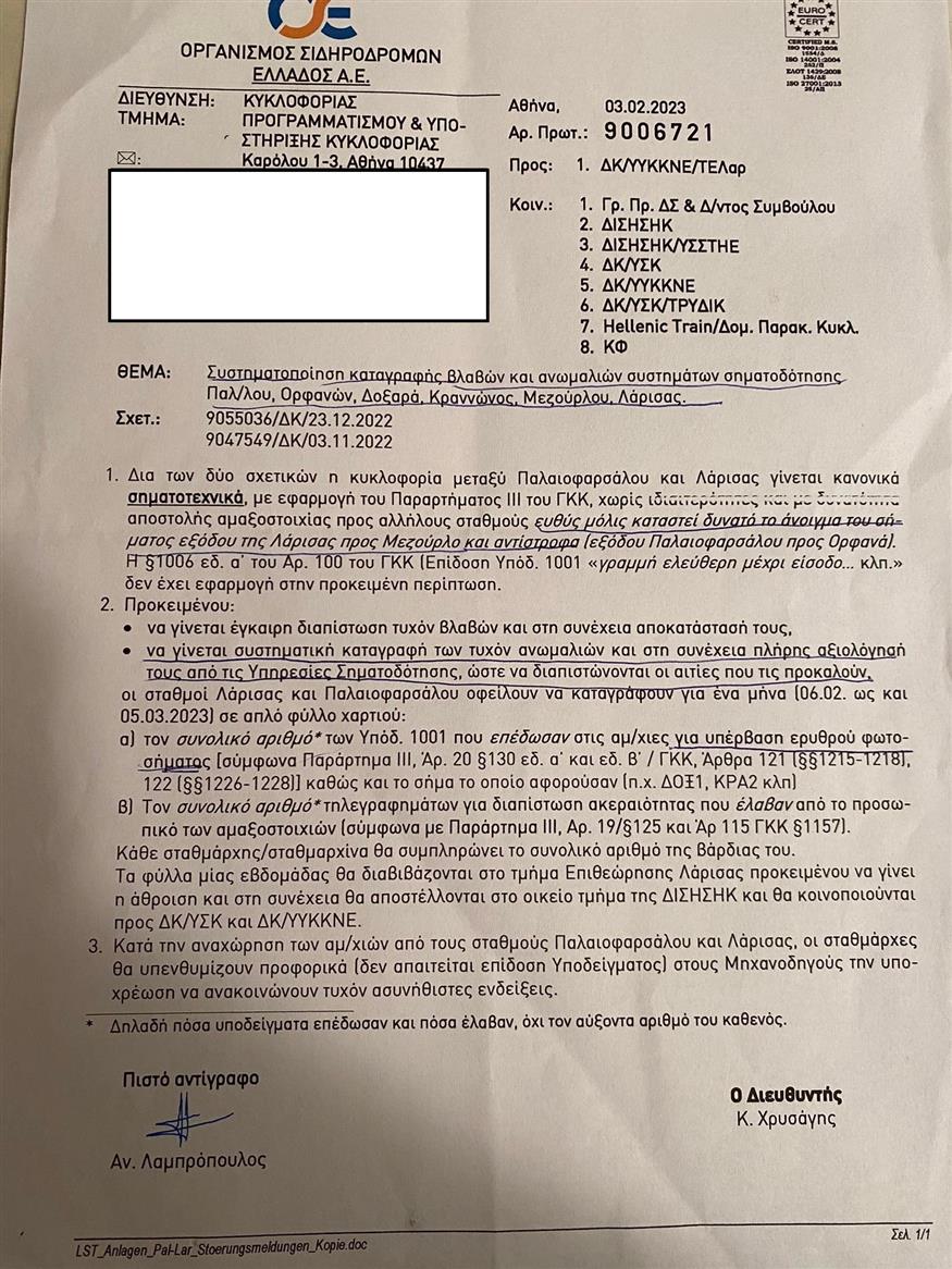 Να σημειωθεί ότι η ύπαρξη και παραδοχή σφαλμάτων και στο σύστημα σηματοδότησης προκύπτει και από άλλο έγγραφο του ΟΣΕ με ημερομηνία 15 Μαρτίου 2023, με το οποίο εγκρίνεται αίτημα της ΕΡΓΟΣΕ για επέκταση των εργασιών της σύμβασης 717/14.