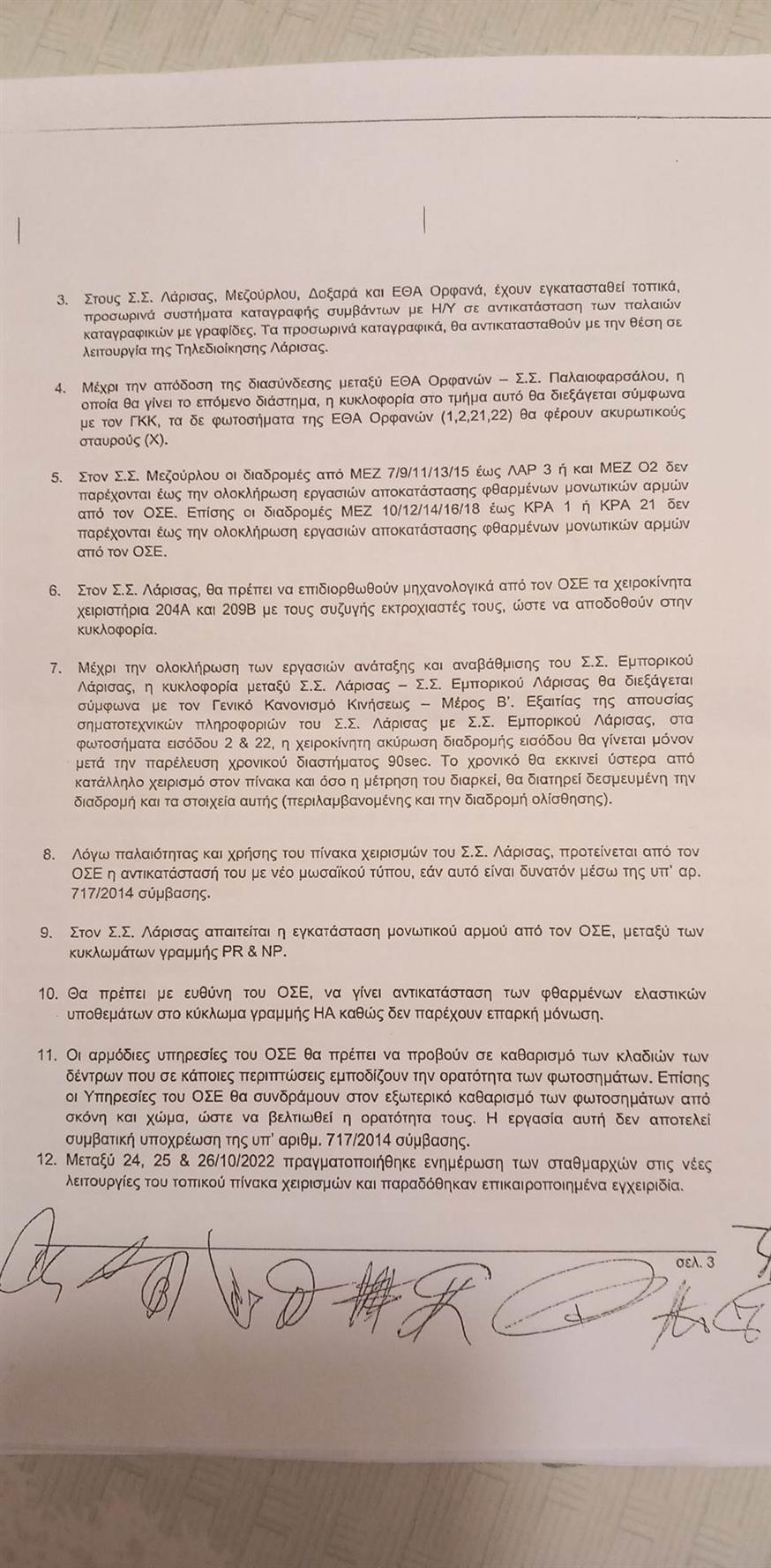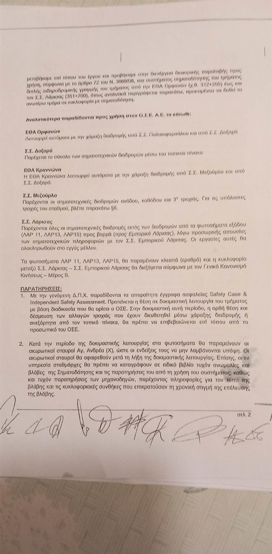 δοκιμών και αποσφαλμάτωσης των συστημάτων σηματοδότησης στους σιδηροδρομικούς Σταθμούς Εμπορικού Λάρισας, Ευαγγελισμού, Λεπτοκαρυάς, Λιτοχώρου, Κατερίνης, Μακρύγιαλου και Αιγινίου και επιτήρησης και άρσης βλαβών του εξοπλισμού της γραμμής στους σταθμούς Παλαιοφαρσάλου, ΕΘΑ Ορφανών, Δοξαρά, Κραννώνα, Μεζούρλου και Λάρισας. Με το έγγραφο μάλιστα καλούνται οι σταθμοί Παλαιοφαρσάλου, Λάρισας, Νέων Πόρων και Λιτοχώρου να ενημερώνουν τις διερχόμενες αμαξοστοιχίες να μη λαμβάνουν υπόψη τις ενδείξεις των φωτοσημάτων του εκάστοτε σταθμού, στον οποίο θα εκτελούνται οι εργασίες.