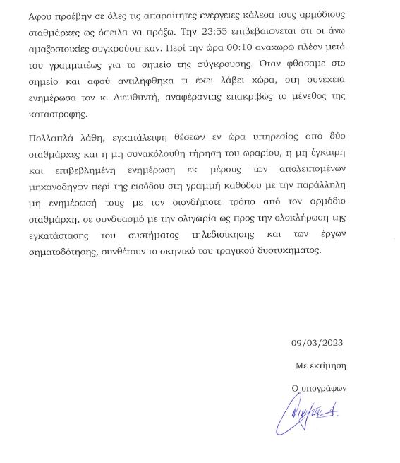 Την δική του εκδοχή για το τραγικό δυστύχημα στα Τέμπη παρουσιάζει με μακροσκελή δήλωση που έδωσε στη δημοσιότητα ο επιθεωρητής του ΟΣΕ, Δημήτρης Νικολάου.