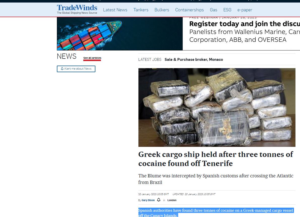 Φορτηγό πλοίο, που φέρεται να είναι ελληνικών συμφερόντων, ακινητοποιήθηκε ανοιχτά της Τενερίφης καθώς εντοπίστηκαν τεσσεράμισι τόνοι κοκαΐνης η αξία των οποίων προσεγγίζει τα 180 εκατομμύρια δολάρια.
