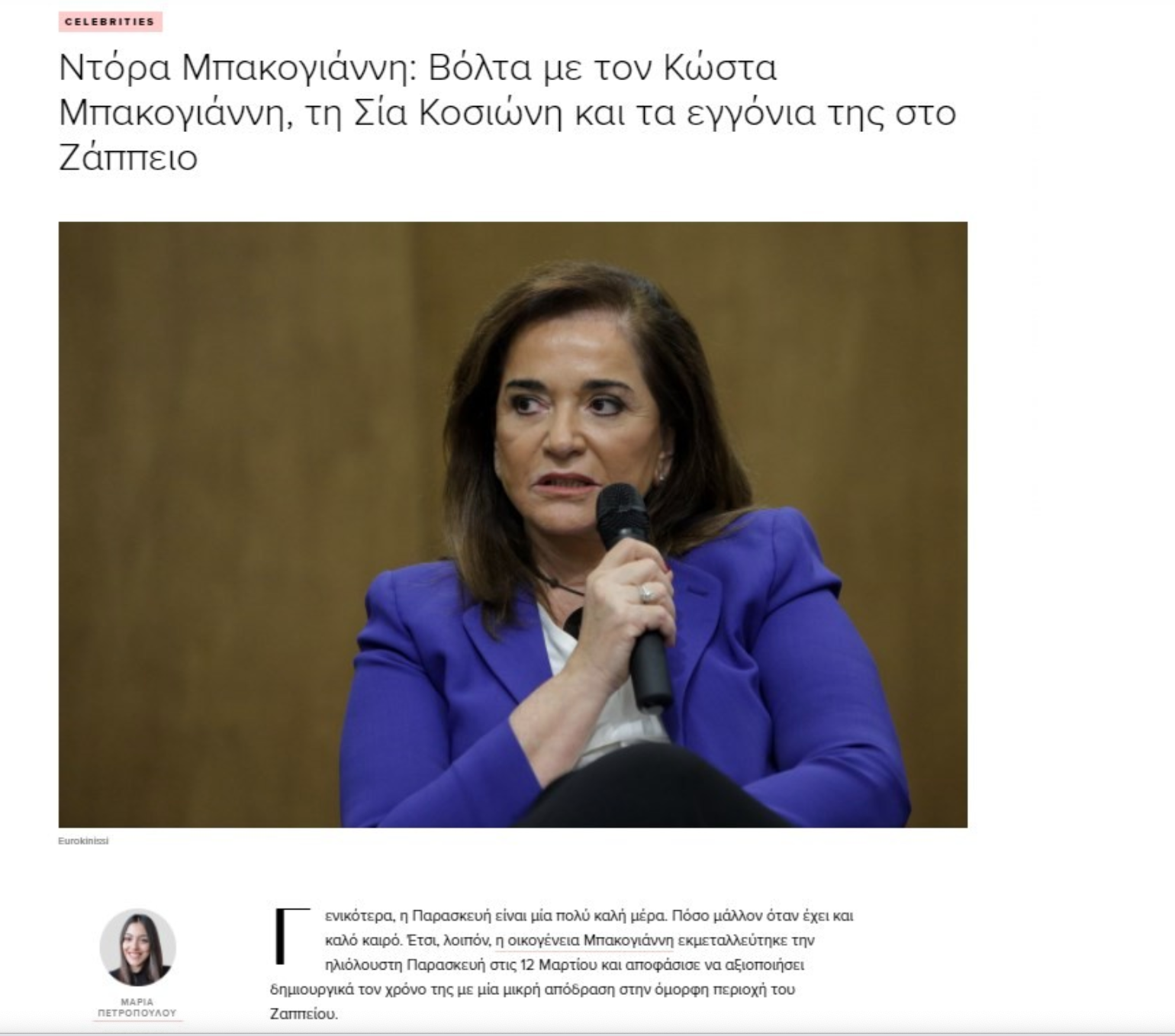 Ερωτηματικά στο μεταξύ προκαλούν δημοσιεύματα που έλεγαν αρχικά ότι λίγες μόνο ώρες μετά το συμβάν η κ. Μπακογιάννη (Ladylike) έκανε βόλτα στο Ζάππειο με τον γιο της δήμαρχο Αθηναίων Κώστα Μπακογιάννη, την νύφη της, δημοσιογράφο του Σκάι Σία Κοσιώνη και τα εγγόνια της.