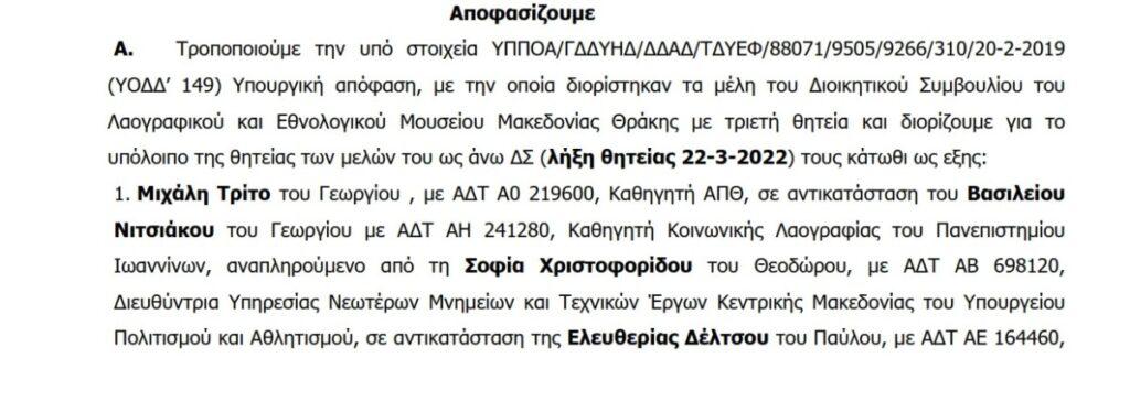 Τον θεολόγο Μιχαήλ Τρίτο διόρισε με απόφασή της η υπουργός Πολιτισμού Λίνα Μενδώνη ως πρόεδρο του Διοικητικού Συμβουλίου του Λαογραφικού & Εθνολογικού Μουσείο Μακεδονίας – Θράκης (ΛΕΜΜ-Θ) στη θέση του παραιτηθέντος καθηγητή Κοινωνικής Λαογραφίας του Πανεπιστημίου Ιωαννίνων Βασίλη Νιτσιάκου.