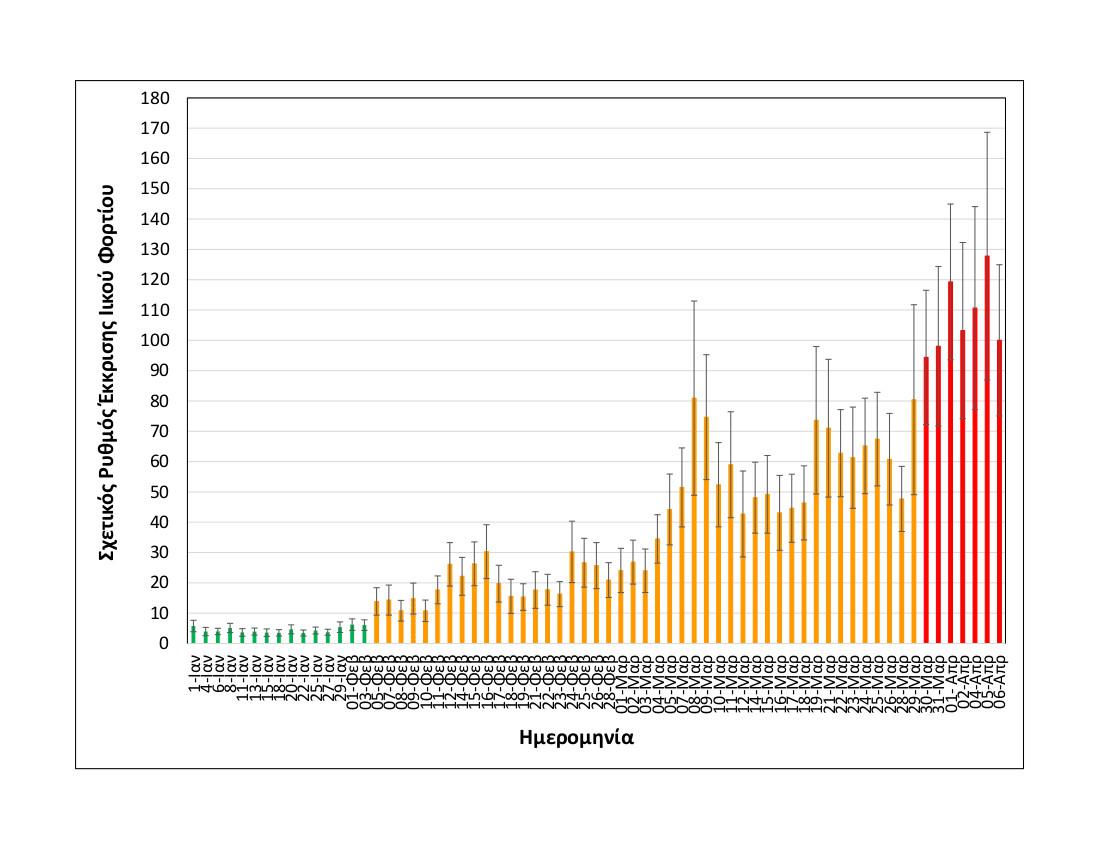 Όπως, εξάλλου, ανακοινώθηκε από τον ΕΟΔΥ, την εβδομάδα 29/3-4/4/2021 παρατηρήθηκε αύξηση (+56%) στον σχετικό ρυθμό έκκρισης του ιικού φορτίου, σε σχέση με την προηγούμενη εβδομάδα, 22-28/3/2021.