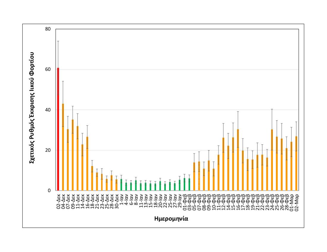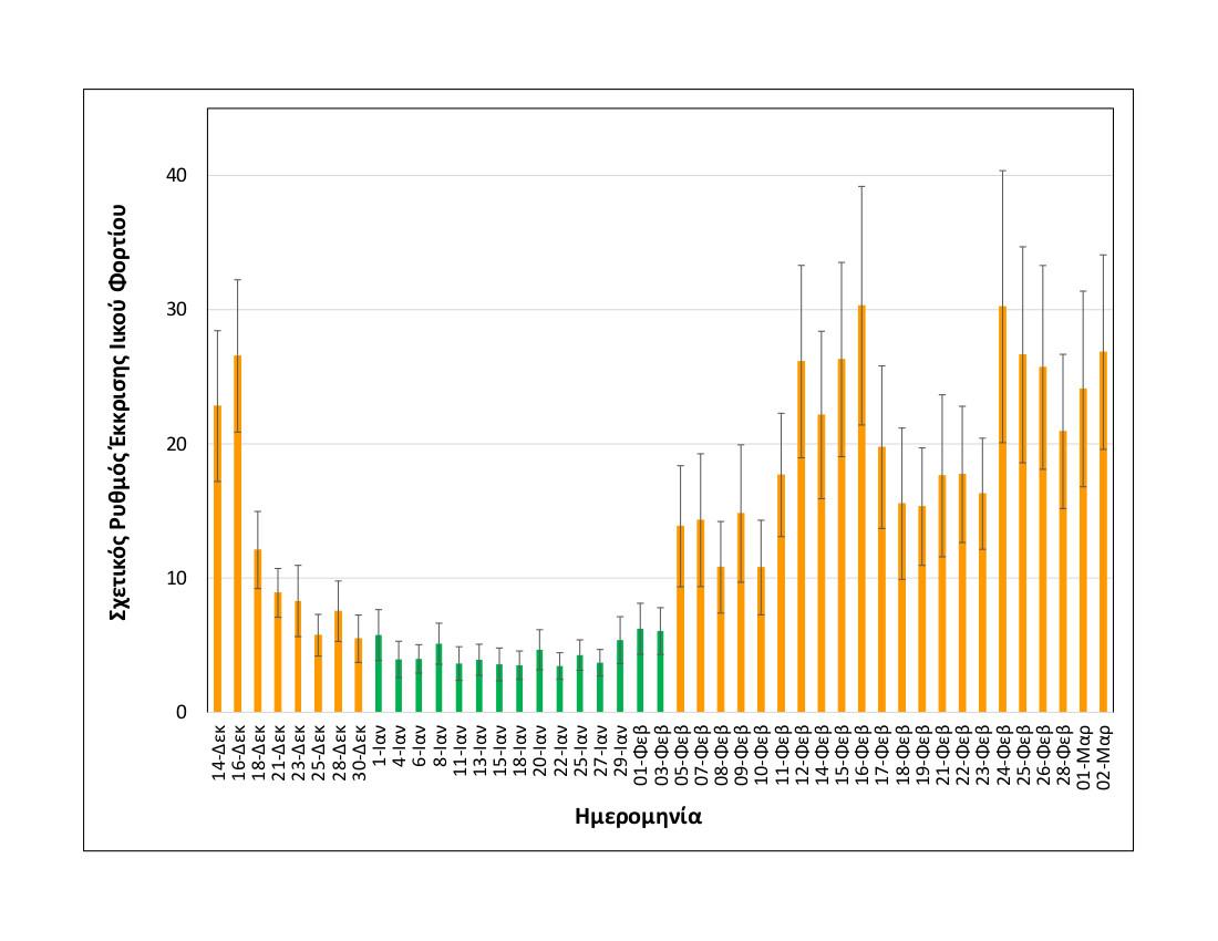 Συγκεκριμένα, η μέση τιμή των δύο πιο πρόσφατων μετρήσεων, δηλαδή της Δευτέρας 01/03 και της Τρίτης 02/03, είναι αυξημένη κατά 10% σε σχέση τη μέση τιμή των δύο αμέσως προηγούμενων μετρήσεων, δηλαδή της Παρασκευής 26/2 και της Κυριακής 28/2 .