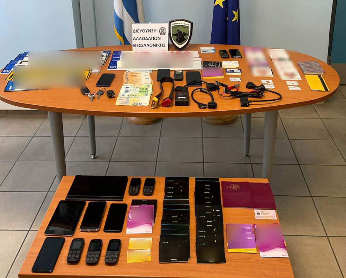 Κατά τη διάρκεια της προχθεσινής επιχείρησης στη χώρα μας, πραγματοποιήθηκαν έρευνες σε οικίες και συνεργείο αυτοκινήτων στη Θεσσαλονίκη και στη Βέροια, όπου συνελήφθησαν πέντε μέλη της οργάνωσης δύο ημεδαποί και τρεις αλλοδαποί και κατασχέθηκαν μεταξύ άλλων, τρία αυτοκίνητα και γερανοφόρο όχημα μεταφοράς οχημάτων,τέσσερα πλαστά ζεύγη πινακίδων κυκλοφορίας, βιβλιάρια τραπεζικών καταθέσεων, ηλεκτρονικές συσκευές (κινητά τηλέφωνα, ταμπλέτες) και 3.500 ευρώ.