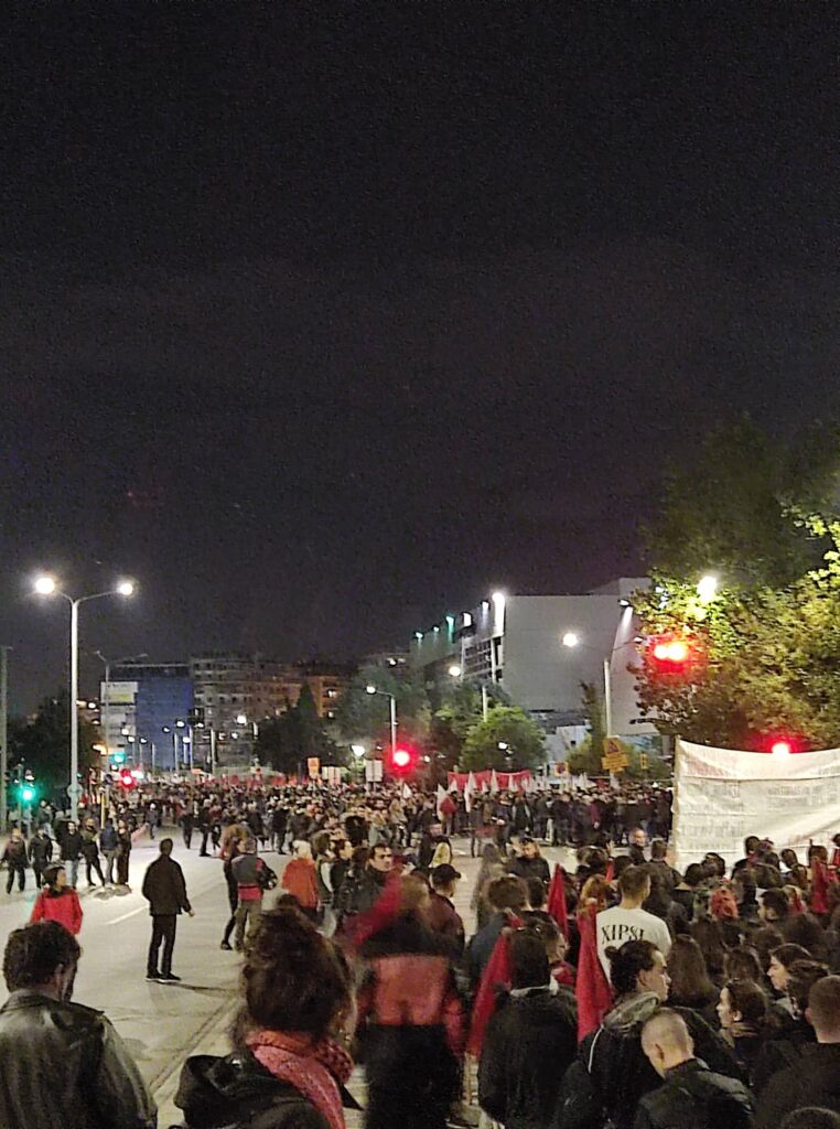 Η πορεία κατεβαίνει αυτή την ώρα την Εθνικής Αμύνης προς Τσιμισκή. Όλα τα γύρω στενά κατακλύζονται από αστυνομικούς.