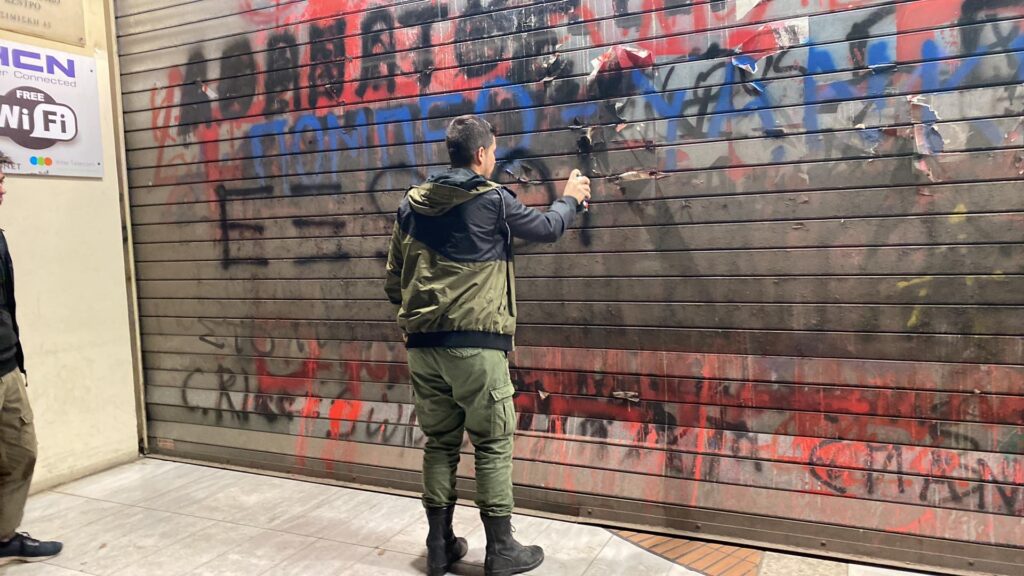Ένα κομμάτι της πορείας ανεβαίνει τώρα την Αριστοτέλους ενώ ένα άλλο τμήμα της φωνάζει συνθήματα έξω από το αμερικάνικο προξενείο.