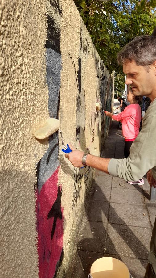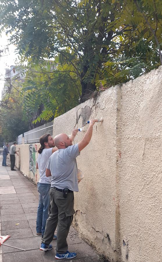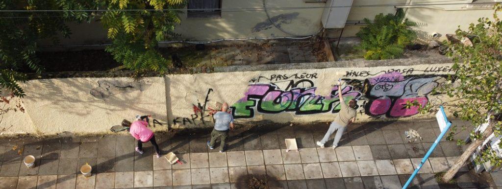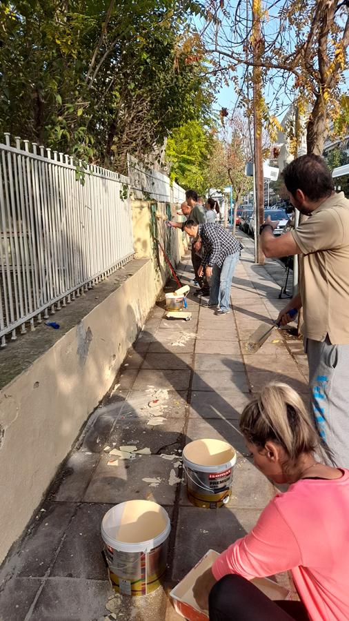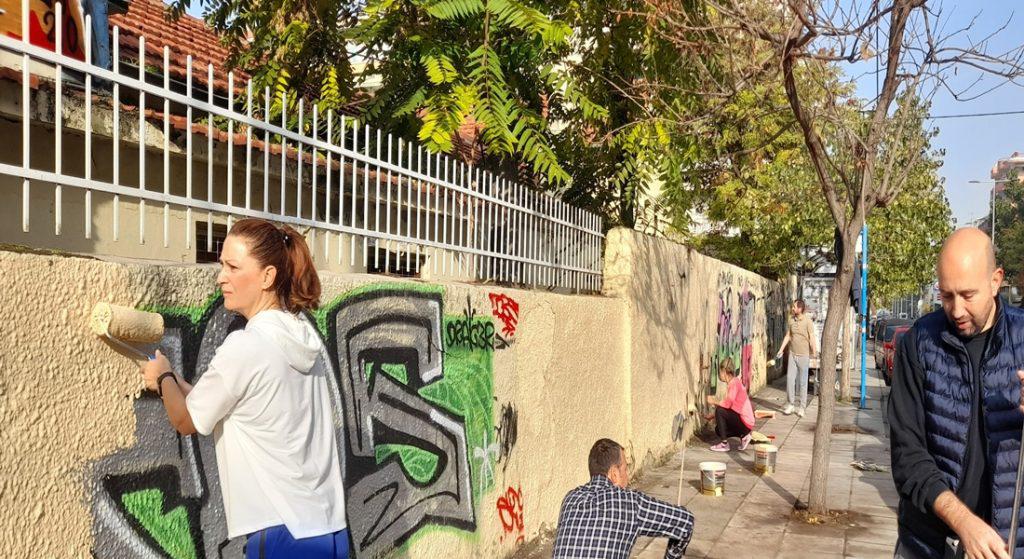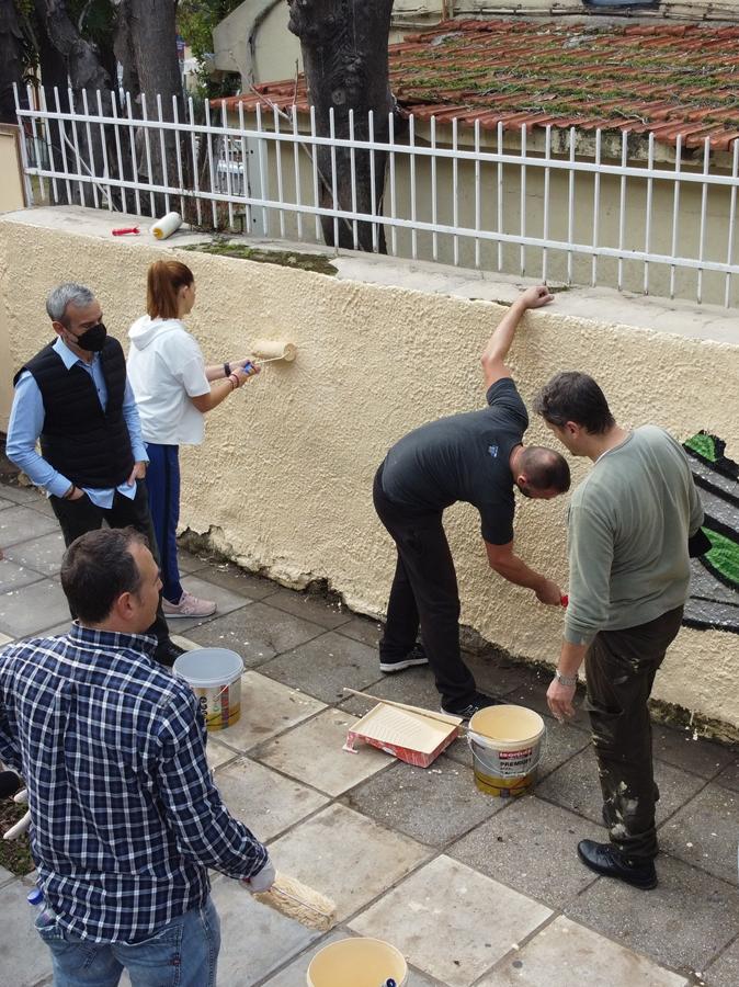 Το κοινωνικό πρόσωπό της έδειξε για ακόμη μία φορά η Δημοτική Αστυνομία Θεσσαλονίκης. Σήμερα (06/11) το πρωί γυναίκες και άνδρες της Δημοτικής Αστυνομίας αποχωρίστηκαν τις στολές με τις οποίες τους έχουμε συνηθίσει κι έπιασαν τα ρολά και τα πινέλα στο πλαίσιο μιας δράσης για καλό σκοπό, για να καθαρίσουν και να βάψουν εξωτερικούς τοίχους του δημοτικού βρεφοκομείου “Άγιος Στυλιανός” που ήταν καλυμμένοι με κακώς εννοούμενα γκράφιτι.