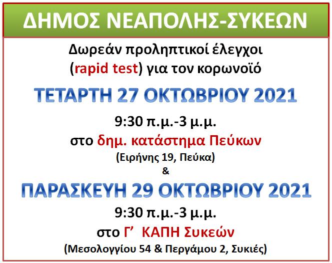 – Την Παρασκευή 29 Οκτωβρίου 2021 θα πραγματοποιηθούν rapid test στο ΚΑΠΗ της Θέρμης.