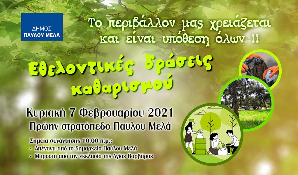 Με σύνθημα «Το περιβάλλον μας χρειάζεται και είναι υπόθεση όλων», οι Αντιδημαρχίες Καθαριότητας, Ανακύκλωσης και Περιβάλλοντος, Πρασίνου, Εθελοντισμού του Δήμου Παύλου Μελά διοργανώνουν στις 3 Κυριακές του Φλεβάρη που ακολουθούν, αντίστοιχες εθελοντικές δράσεις καθαρισμού μεγάλων δημόσιων χώρων, εν μέσω πανδημίας και με τήρηση όλων των απαραίτητων μέτρων ασφάλειας.