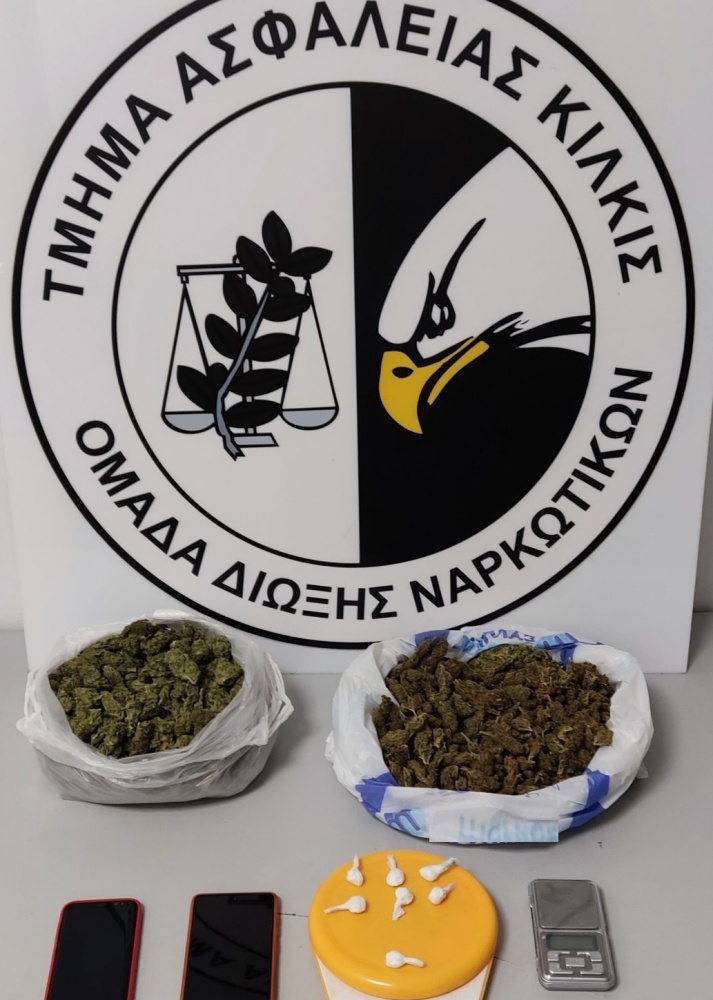 Καθώς, σε έρευνα της οικίας του, βρέθηκαν και κατασχέθηκαν: ποσότητες κάνναβης βάρους 945 γραμμαρίων, κοκαΐνη βάρους 7,7 γραμμαρίων και 2 ηλεκτρονικές ζυγαριές ακριβείας.