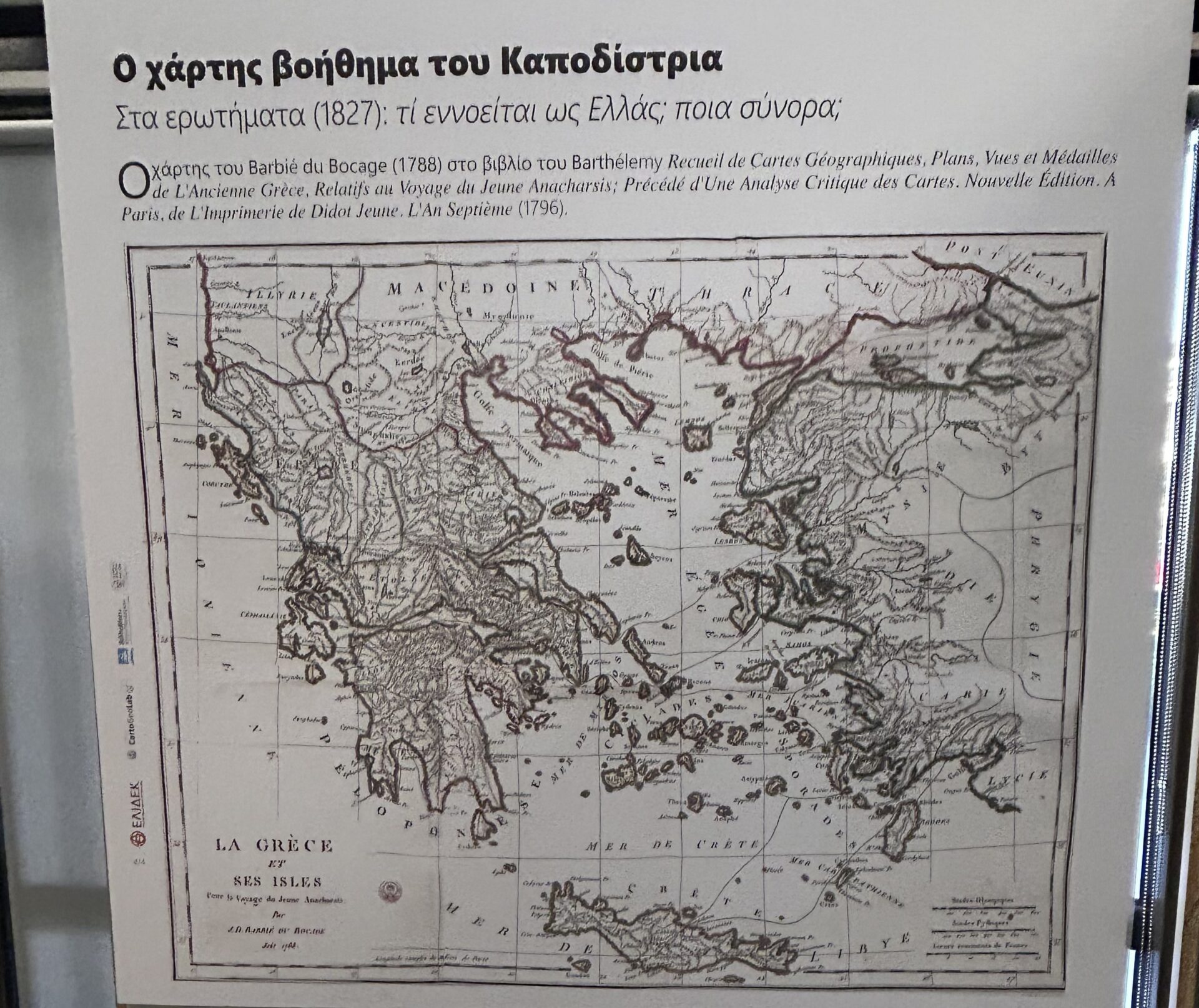 Η γραμμή του συγκεκριμένου χάρτη του Μπαρμπιέ ντυ Μποκάζ, όπως εξήγησε ο κ. Λιβιεράτος, «αντιστοιχεί στη γραμμή του πίνακα του Άνθιμου Γαζή, ήταν από τα κείμενα της γεωγραφίας του Καποδίστρια ο επίμονος στόχος, πριν υποχωρήσει στη γραμμή Όλυμπος- ακτές, στην ‘’φυσικωτάτη λύση’’, δηλαδή, η πρώτη του προσπάθεια έγινε για αυτά τα σύνορα’».